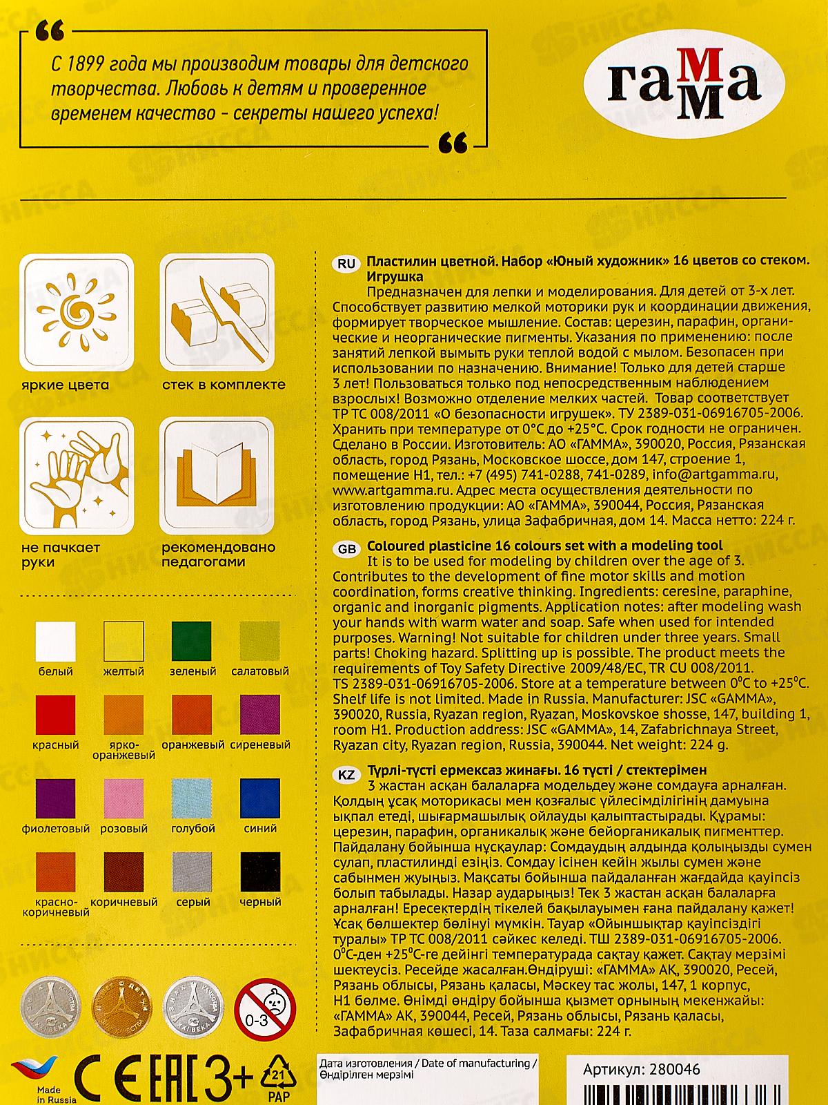 Пластилин 16 цветов 224 грамм ГАММА Юный художник, со стеком, 280046 *10