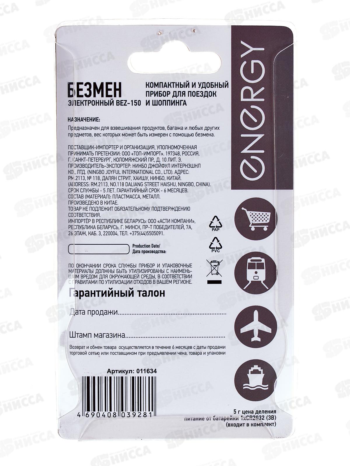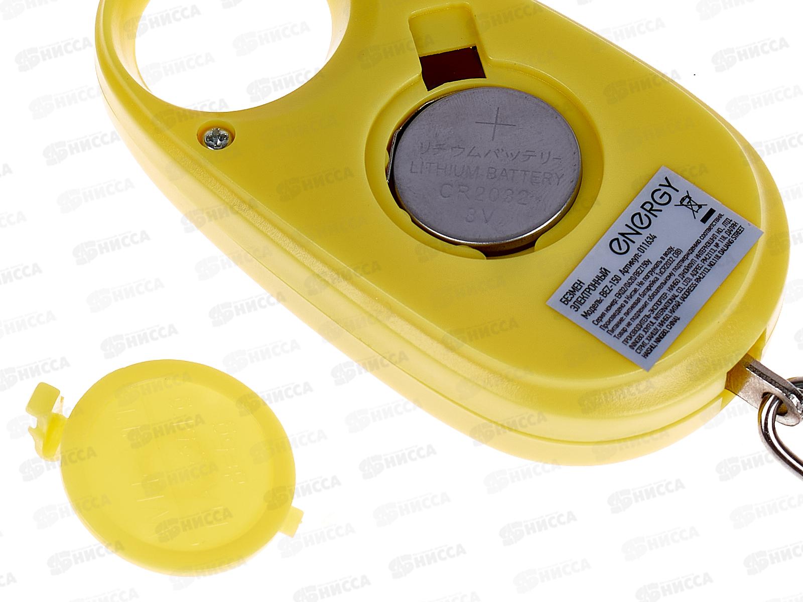 Электронный безмен Energy применяется для эксплуатации в домашних условиях, а также в сфере уличной торговли. Весы имеют прочный корпус. Устойчивы к ударам и падениям. Максимальная нагрузка составляет 25 кг. Питание от 1 батарейки СR2032, есть в комплекте.