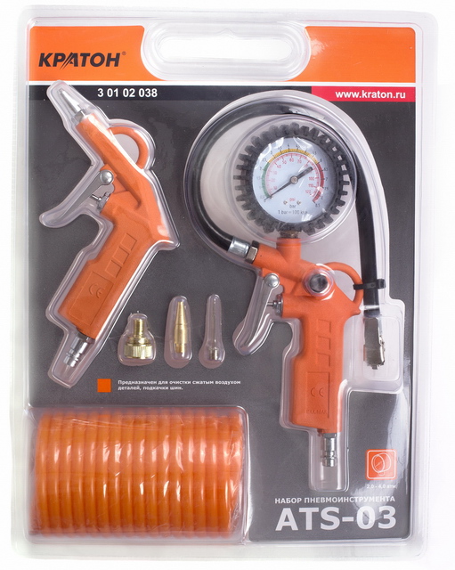 Комплектация: продувочный пистолет, пистолет для подкачки шин с манометром, спиральный шл
