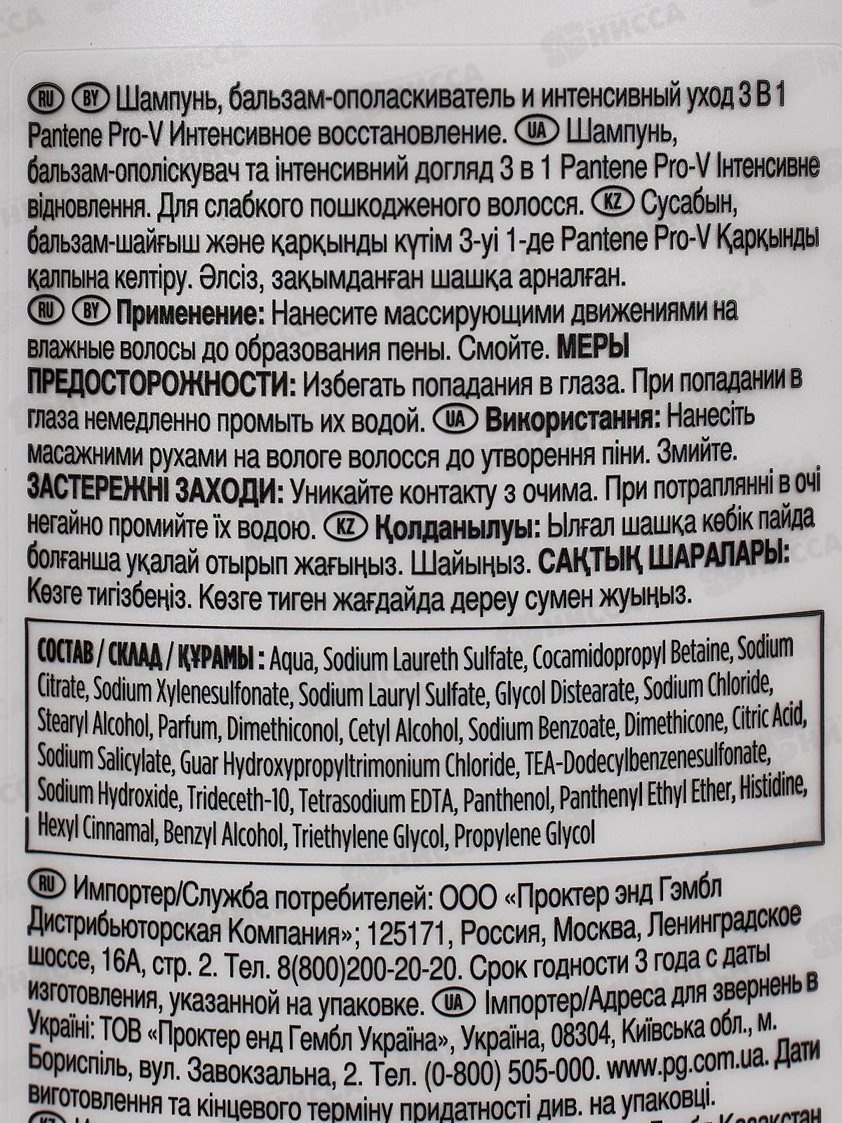 Шампунь Pantene Pro-V "Интенсивное восстановление" 3в1 + кондиционер + интенсивный уход очищает, облегчает расчесывание и восстанавливает волосы за одно применение. Заряжает волосы активными питательными веществами Pro-V. Мгновенно устраняет признаки повреждения. Помогает избежать повреждения волос во время укладки. Предотвращает появление секущихся кончиков. Мгновенно устраняет признаки повреждения. Для ослабленных, поврежденных волос.