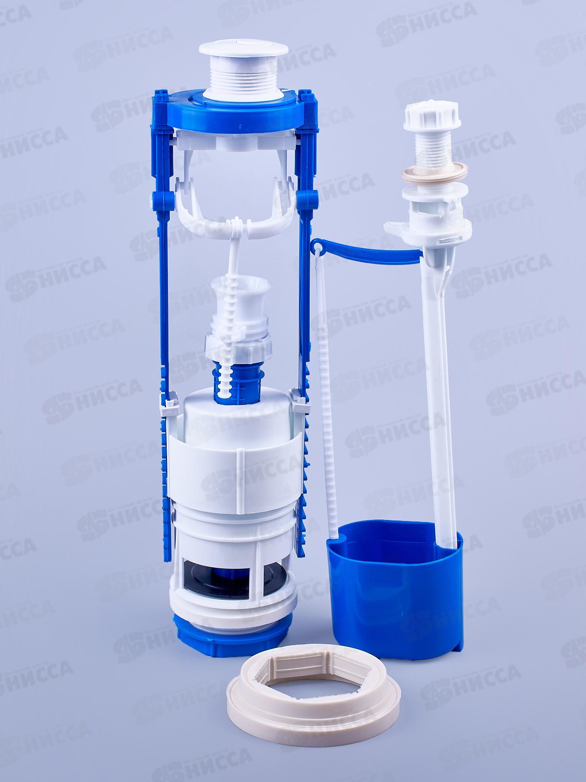 Арматура АС-12.1 кнопочная 2-х уровневая с клапаном АН-01 нижней подводки воды. Данная арматура качественно отличается от штоковых арматур, при этом она включает в себя лучшие их качества. Арматура универсальная: устанавливается и в "средние" бачки (высота до крышки бачка от 310 мм до 390 мм), и "высокие" (высота до крышки бачка 420 мм). В данной модели используется наполнительная арматура нижней подводки, прямого действия. Запирание происходит путём воздействия поплавка через тягу, водило на ползун мембраны, которая перекрывает подающее отверстие сетевой воды.
