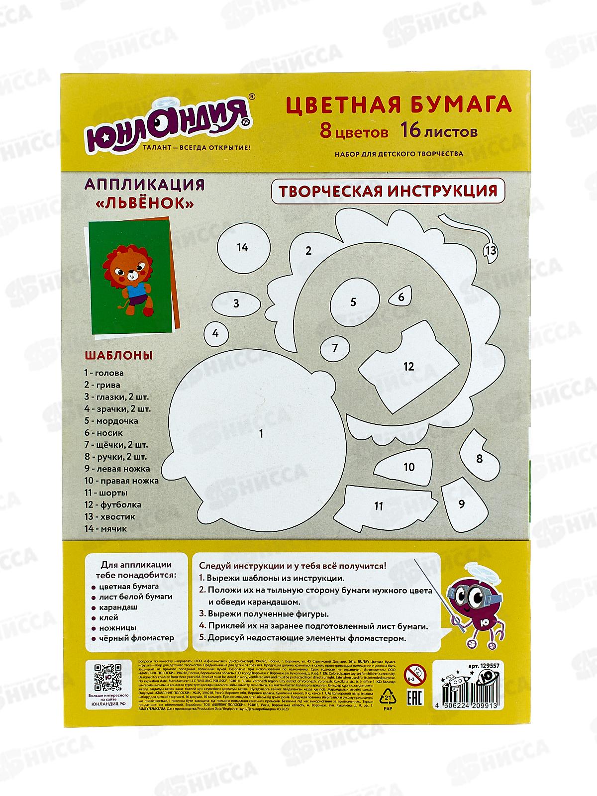 Набор односторонней цветной бумаги предназначен для творчества и хобби и может использоваться детьми с трехлетнего возраста. Инструкция по созданию аппликации на обороте.