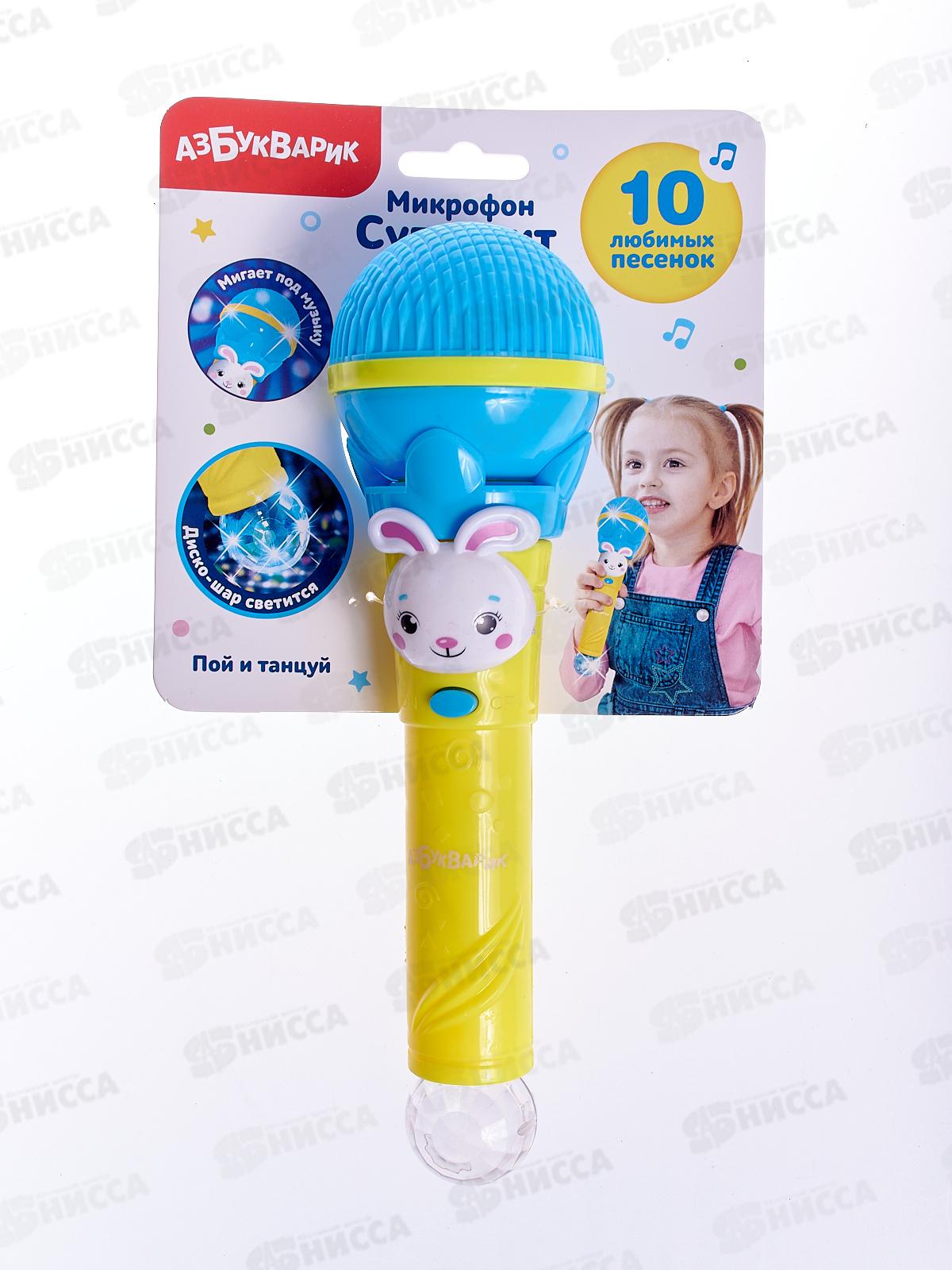 Что нужно для зажигательной детской дискотеки? Конечно, большой микрофон Суперхит с популярными детскими песенками и светомузыкой. Нажимай на кнопочку – слушай 10 веселых песенок и потешек: «Антошка», «Заинька, попляши!», «Ладушки», «Пошёл котик на торжок», «Петушок», «Весёлая карусель», «Тень-тень, потетень», «Каравай», «Водичка», «Мишка косолапый». Подпевай любимым героям и не забывай танцевать! Разноцветные огоньки мигают под музыку – вот это волшебство!