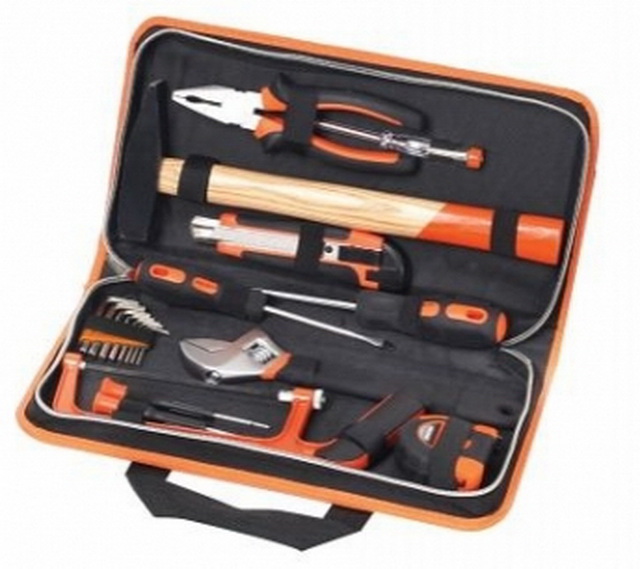 Набор слесарного инструмента Кратон ST-04/19 2 12 15 004 подходит для домашнего мастера. Инструмент уложен в специальную сумку с застежкой-молнией. Для каждого инструмента имеется отдельная позиция для удобства хранения. Это позволяет работать с набором максимально удобно. Комплектация: пассатижи, ключ разводной, 4 отвертки, отвертка тестер, ключи шестигранные, нож строительный, рулетка, молоток, ножовка по металлу.