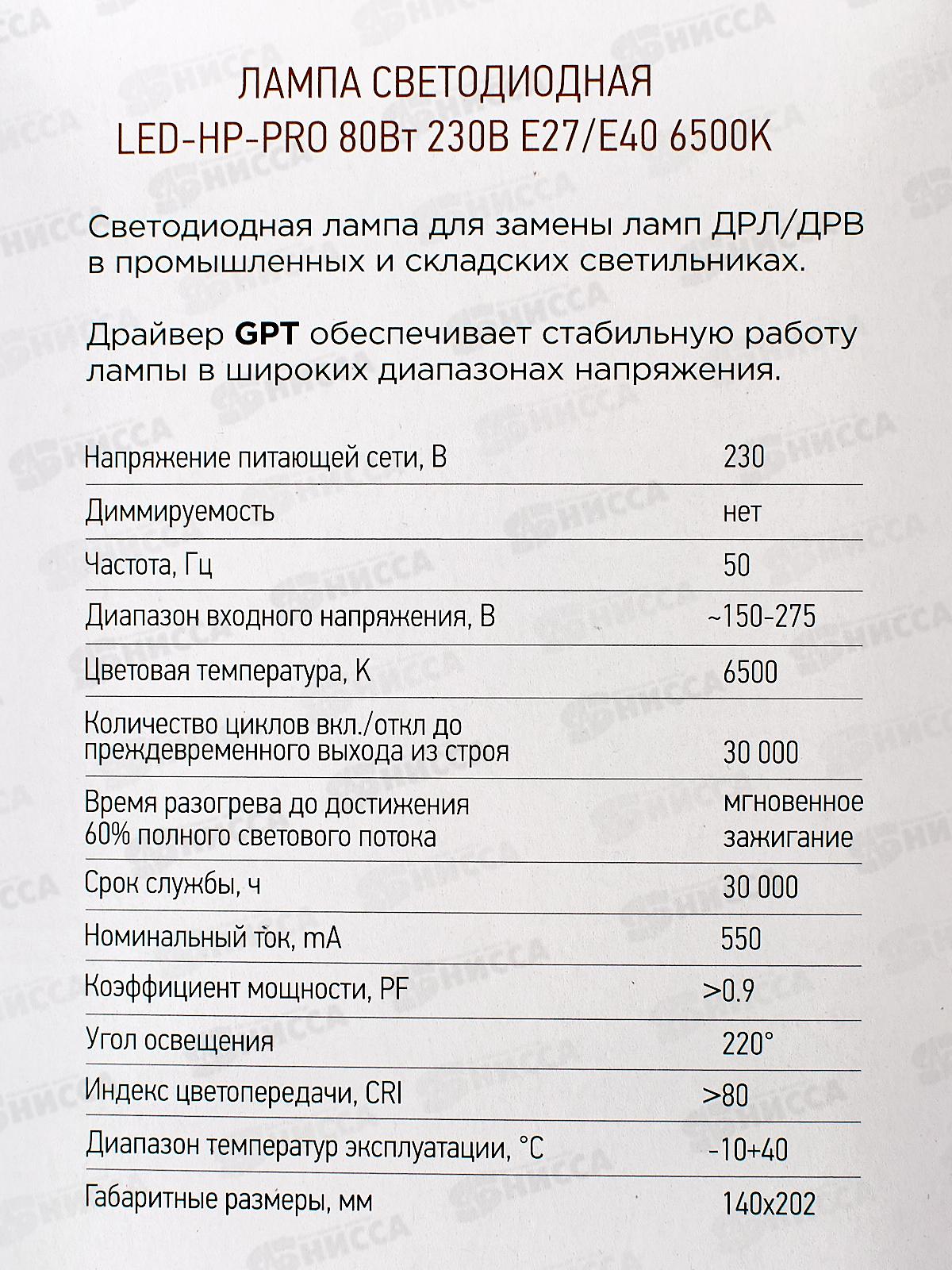 Лампа светодиодная IN-HOME LED-HP-PRO 80Вт E27 с адаптером под Е40 6500К 7200Лм *30