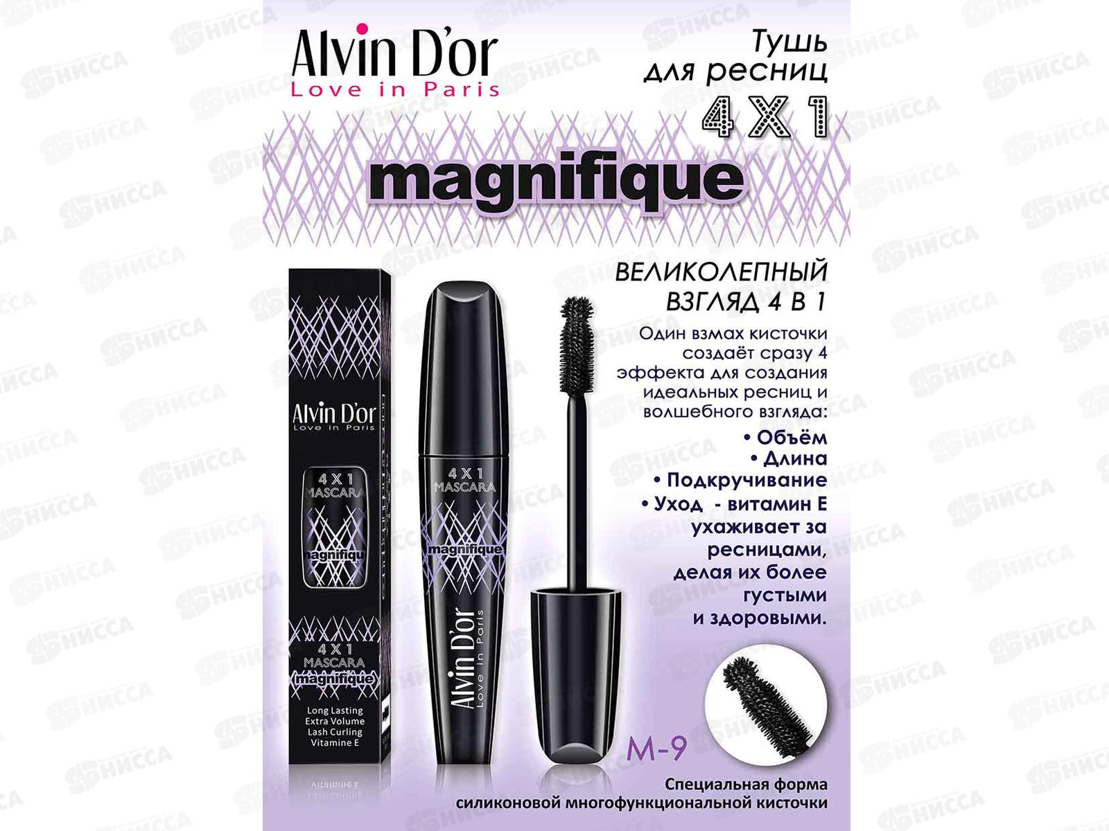Тушь для ресниц Magnifique от бренда Alvin D'or. Тушь всего одним взмахом кисточки создает идеальные объем, длину и подкручивание ресниц. Витамин Е в составе делает волоски более густыми и здоровыми. Средство имеет многофункциональную силиконовую кисточку со специальной формой.