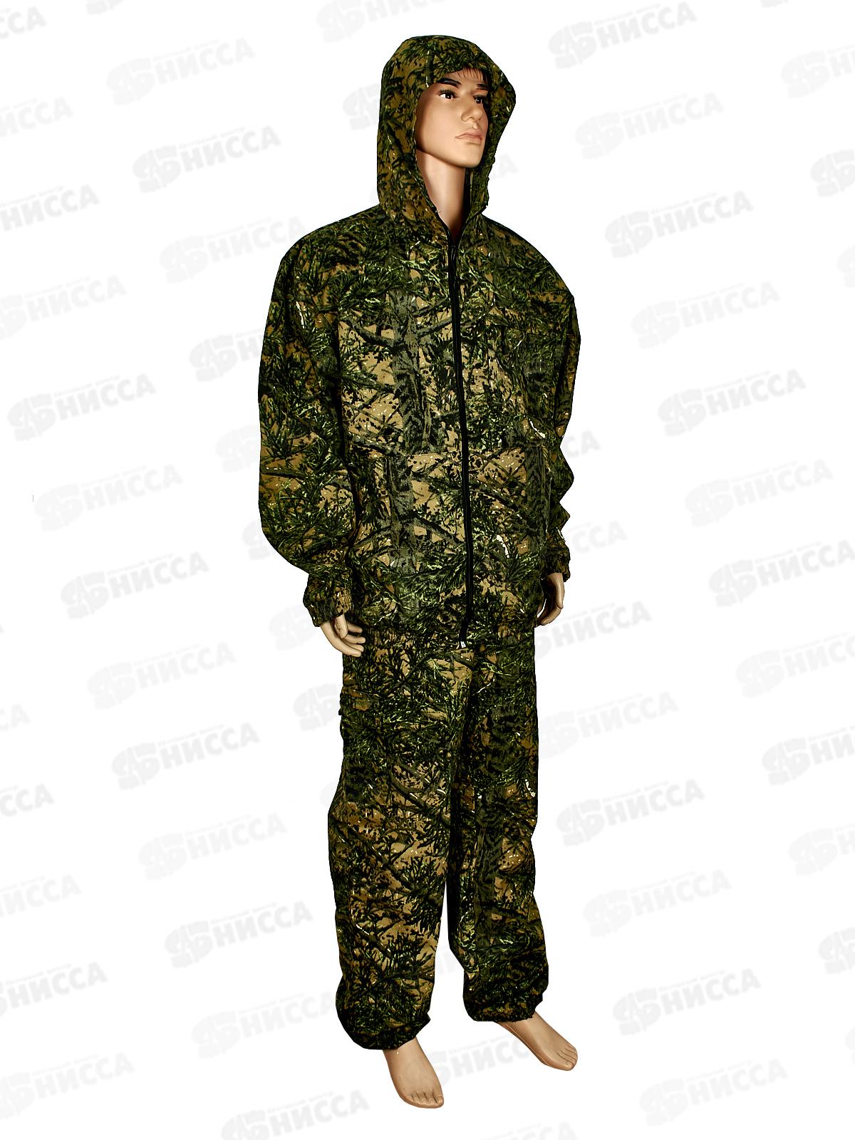 Камуфлированный унверсальный летний костюм для охоты, рыбалки и активного отдыха. Состоит из куртки с капюшоном и брюк. Куртка с регулируемым капюшоном. Центральная застежка молния. Боковые и нагрудный накладные карманы на молнии. Низ куртки и манжеты на резинке. В брюках два врезных кармана и два накладных кармана на молнии. Пояс и низ брюк на резинке.