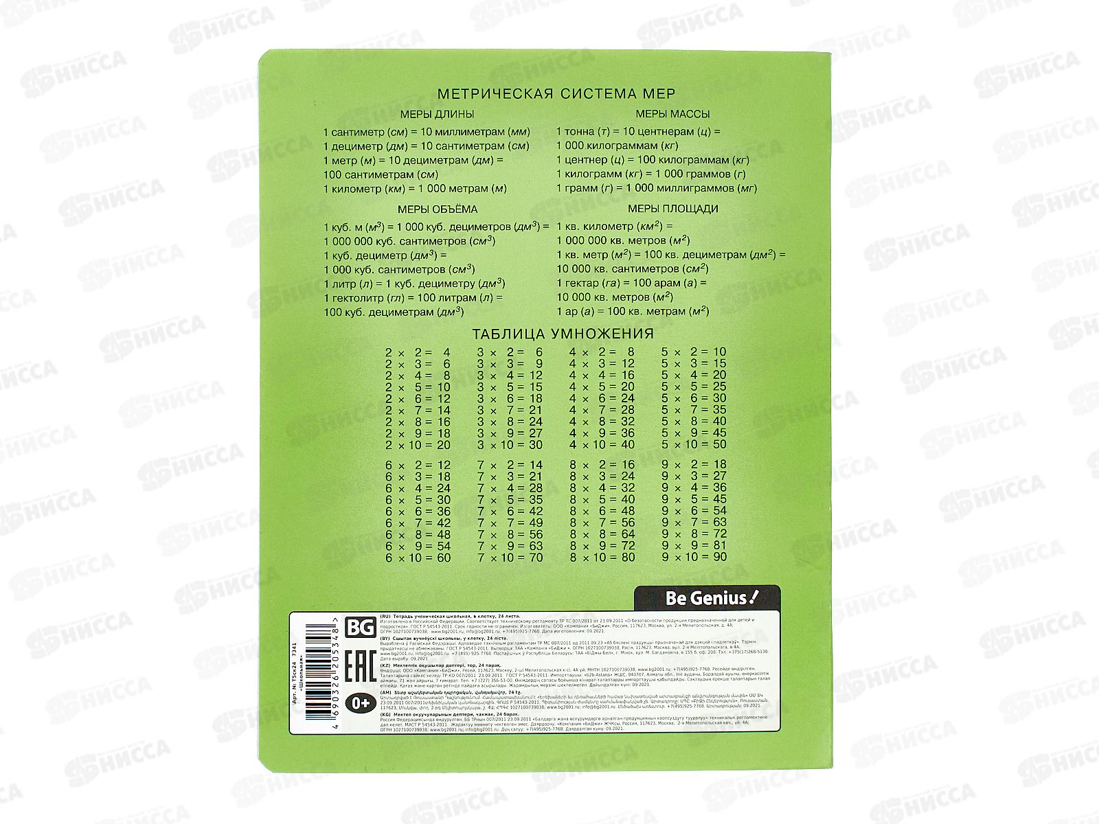 Тетрадь 24 листа клетка BG Школьная, зеленая, 7341*12/120