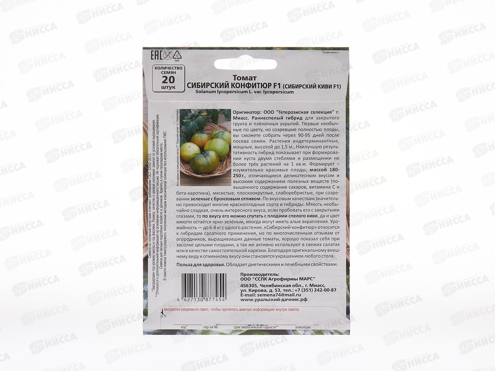 Раннеспелый гибрид для закрытого грунта и плёночных укрытий. Первые необычные по цвету, но созревшие полностью плоды, вы сможете собрать через 90-95 дней после посева семян. Растения индетерминантные, мощные, высотой до 1,5 м, Наилучшую результативность гибрид показывает при формировании куста двумя стеблями и размещении не более трёх растений на 1 м2. Формирует изумительно красивые плоды, массой 180-250 г, отличающиеся деликатесным вкусом и высоким содержанием полезных веществ (повышенного содержания сахаров, витамина С и бета-каротина), мясистые, плоскоокруглые, слаборебристые, при созревании зелёные с бронзовым отливом. По вкусовым качествам значительно превосходит многие красноплодные сорта и гибриды. Мякоть необычайно сладкая, очень интересного вкуса, если пробовать его с закрытыми глазами, то по вкусу его можно спутать с плодами спелого киви, да и цвет мякоти остаётся ярко-зелёным, иногда могут иметь алые вкрапления. Урожайность — до 6-8 кг с одного растения. Сибирский конфитюр» относится к гибридам салатного применения, но по многочисленным отзывам от огородников, выращивавших данные томаты, хорошо показал себя при засолке целыми плодами, а так же активно используют в свежих салатах или в качестве самостоятельной нарезки. Благодаря оригинальному внешнему виду и отменному вкусу они становятся украшением любого стола. Польза для здоровья. Обладает диетическими и лечебными свойствами. ВАЖНО ЗНАТЬ! Многие огородники срывают плоды, не дождавшись их полной зрелости или же наоборот значительно переспевшими и бывают разочарованы вкусом, в связи с чем, нужно правильно выбрать момент для сбора плодов. Спелость можно определить наощупь: потрогали, если твердый плод, то ещё не созрел, а если становится мягковат, то в самый на еду. Незрелые плоды зелёные, созревшие зелёные с розовыми или желтыми вкраплениями, хорошо выраженное тёмно-зелёное пятно у плодоножки.
