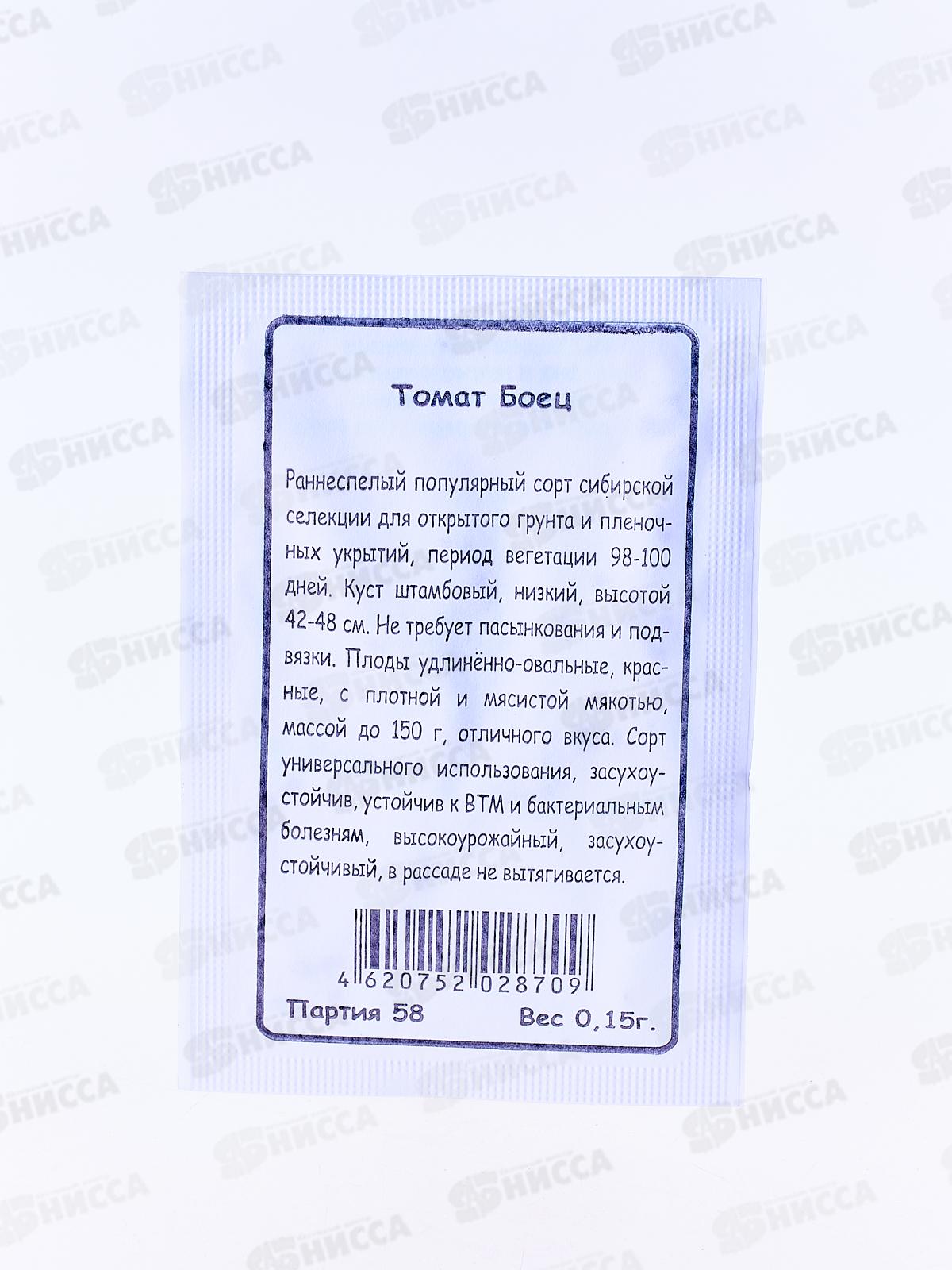 Томат Боец - знаменитый сорт селекции СИБНИИРС для открытого грунта. Скороспелый, низкорослый, 30-40 см. Куст штамбовый, не требует пасынкования и подвязки. Плоды красные, удлинённо-овальной формы, массой 70-180 г. Используются в свежем виде и для цельноплодного консервирования. Достоинства сорта: раннеспелость, урожайность, штамбовый тип куста, в рассаде не вытягивается, высокое качество, оригинальная форма, универсальное использование плодов. Сорт прошёл акклиматизацию в Западно-Сибирском регионе. Для получения обильных урожаев рекомендуется производить своевременные подкормки и полив растений в течение всего вегетационного периода.
