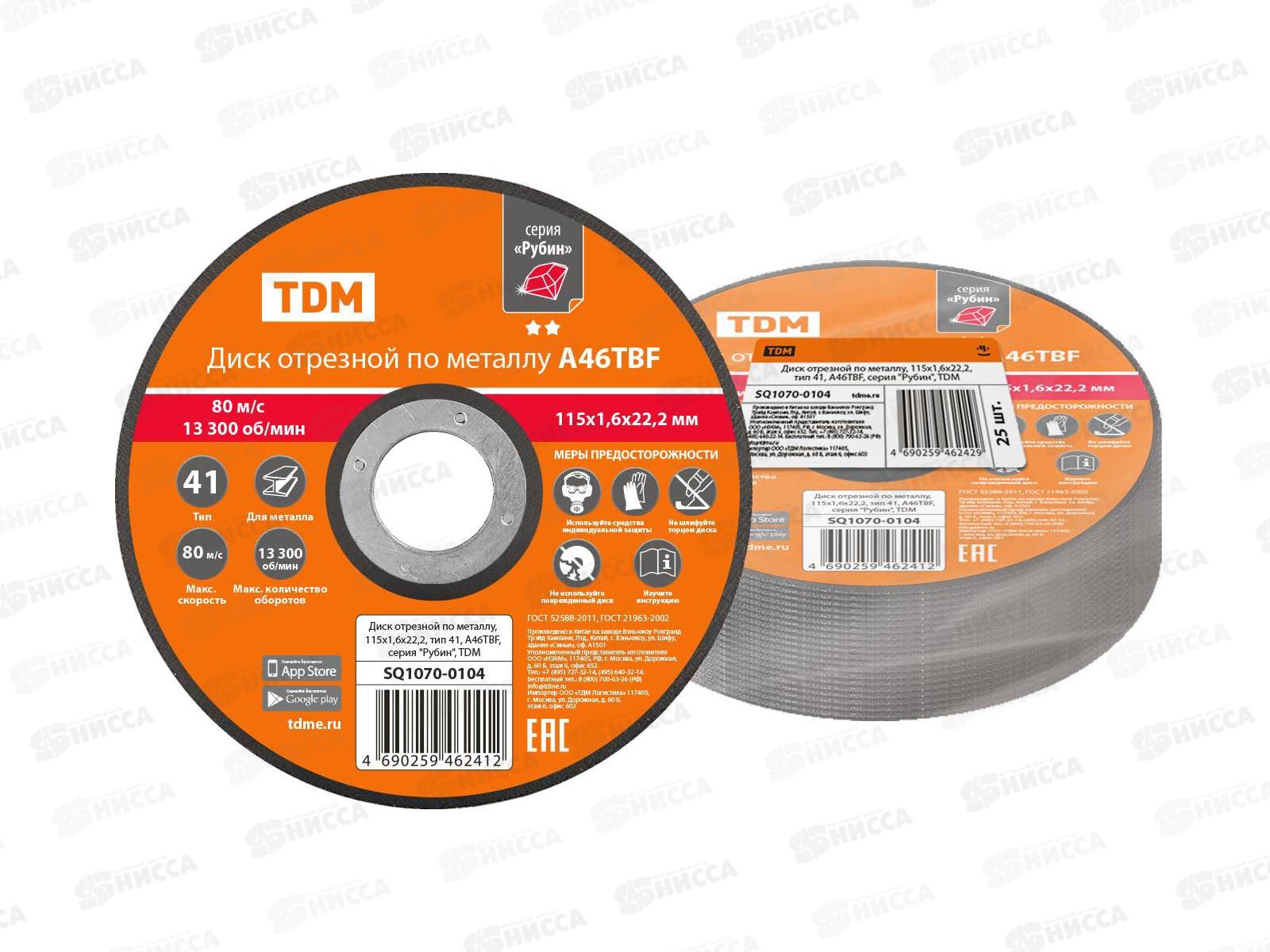 Диск отрезной по металлу, 115х1,6х22,2, тип 41, A46TBF, серия "Рубин", TDM