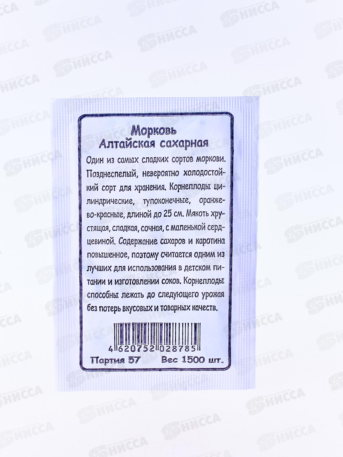 Семена Морковь "Алтайская Сахарная" позднеспелый, холодостойкий сорт для хранения, 1,5 г всходят быстро и массово, не доставляя садоводу никаких проблем. Неприхотливое растение образует красивый плод, который отличается высоким содержанием ценных микроэлементов и показывает великолепный вкус и в кулинарных блюдах, и в домашних консервах. Сорт, выведенный опытными селекционерами, устойчив к распространённым болезням, не боится холода и засухи. Он активно растёт и плодоносит в условиях низкой освещённости.