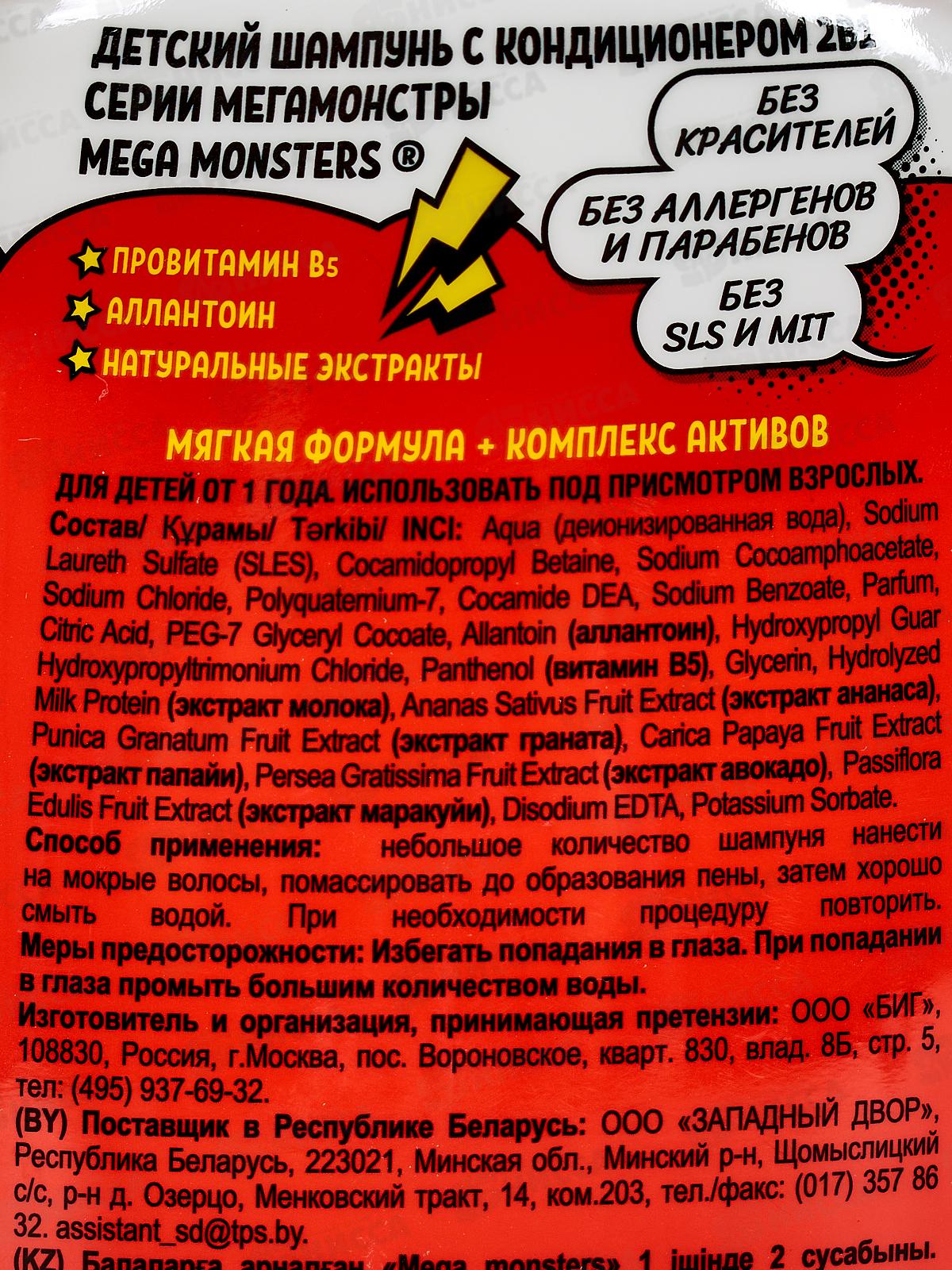 Состав: деионизированная вода, лауретсульфат натрия (SLES), кокамидопропилбетаин, кокоамфоацетат натрия, хлорид натрия, поликватерниум-7, кокамид ДЭА, бензоат натрия, отдушка, лимонная кислота, ПЭГ-7 глицерил кокоат, аллантоин (аллантоин), гидроксипропилгуар гидроксипропилтримониум хлорид, пантенол (витамин). В5), глицерин, гидролизованный молочный белок (экстракт молока), экстракт плодов Ananas Sativus (экстракт ананаса), экстракт плодов Punica Granatum (экстракт граната), экстракт плодов Carica Papaya (экстракт папайи), экстракт плодов Persea Gratissima (экстракт авокадо), экстракт плодов Passiflora Edulis (экстракт маракуйи), динатрий ЭДТА, калий Сорбат.