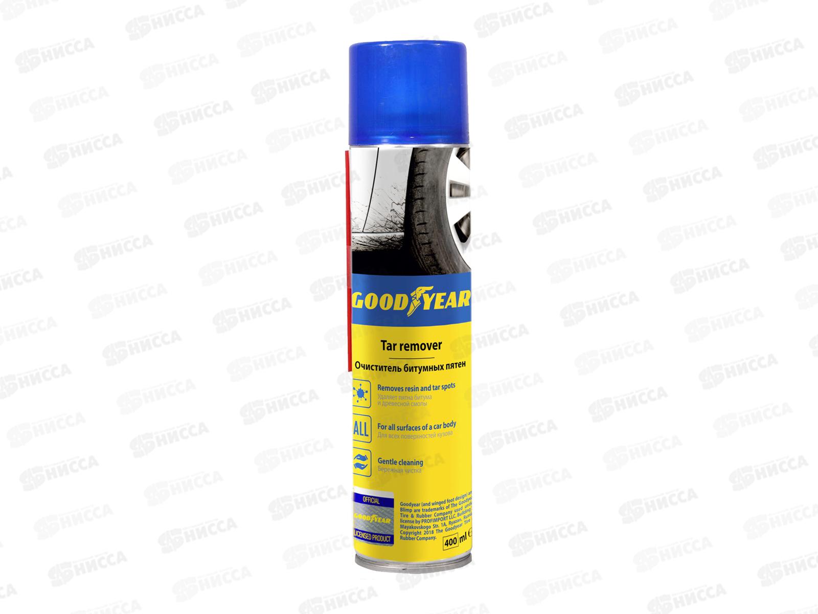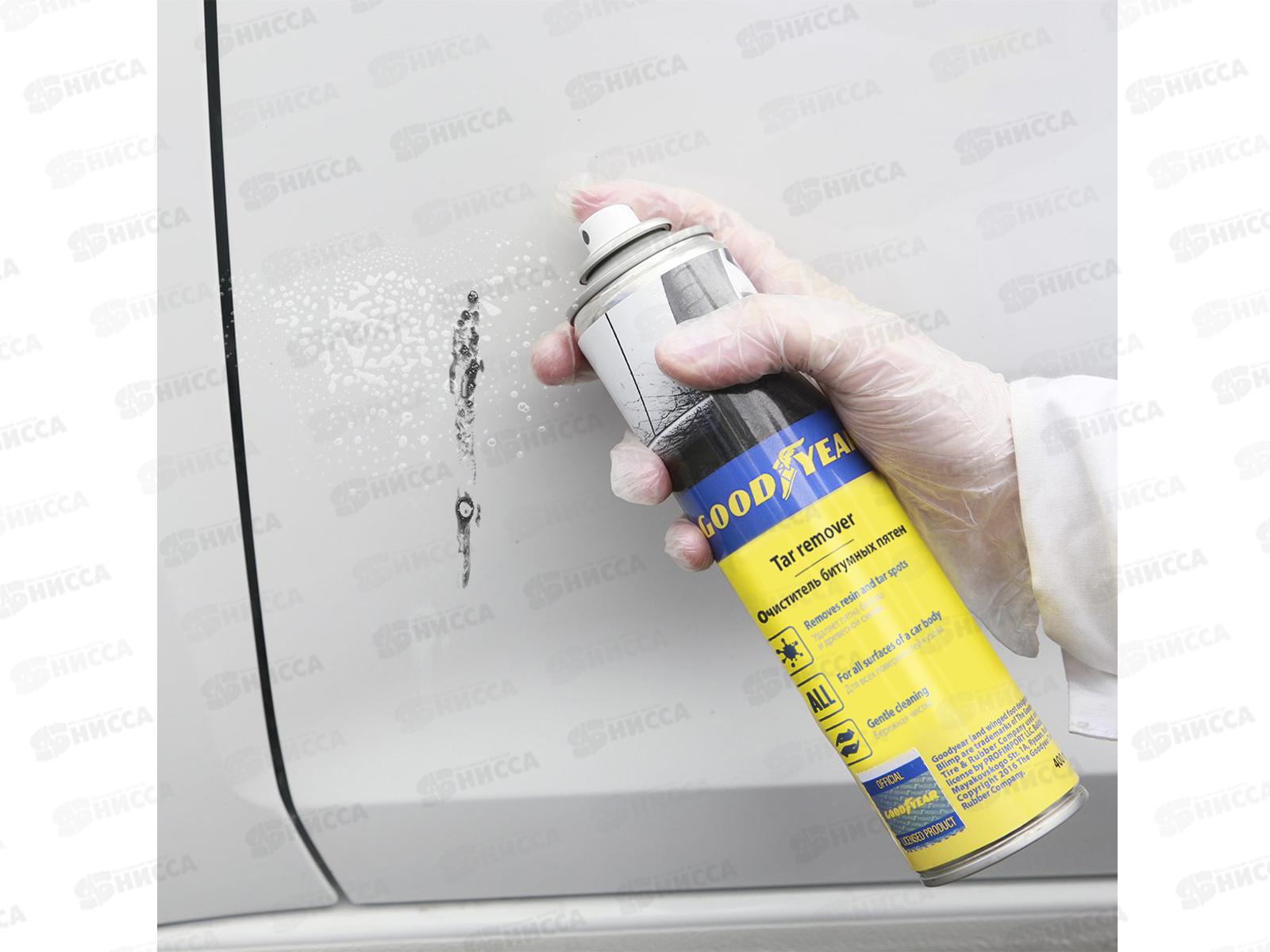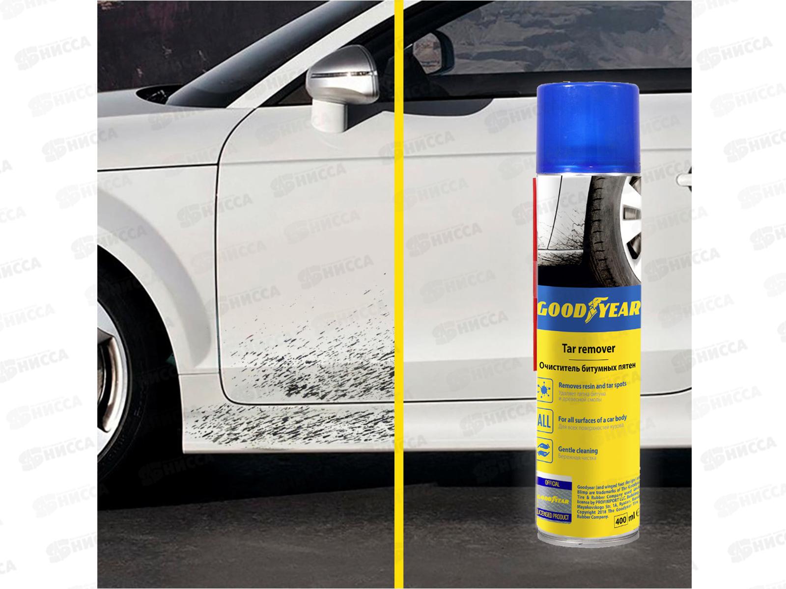 Очиститель битумных пятен Goodyear применяется для очистки поверхности автомобиля, а также, фар, стекол и зеркал от битумных пятен, тополиных и липовых почек, следов масел и пр. Бережно удаляет загрязнения без вреда для ЛКП автомобиля. Состав: органический растворитель ?30%, пропан-бутан ?30%, функциональные добавки <5%, ароматизатор <5%.