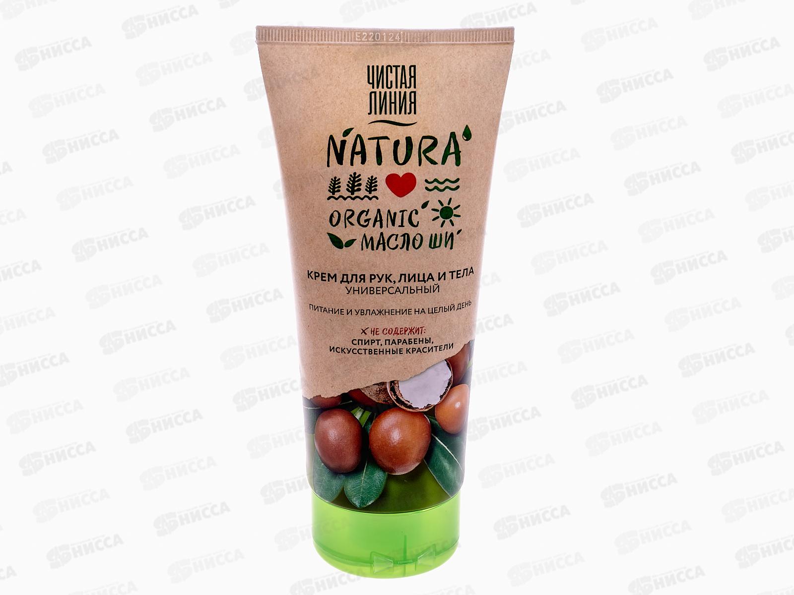 Универсальный крем Чистая Линия Natura для рук, лица и тела с organic масло ши хорошо питает, увлажняет, смягчает, успокаивает, защищает кожу от воздействия солнечных лучей и способствует ее восстановлению, обладает противовоспалительной активностью и регенерирующими свойствами. Не содержит: парабены, спирт. Главный действующий ингредиент - organic масло ши. Глубоко проникает и питает, препятствуя испарению влаги, восстанавливает и возвращает коже упругость. Масло ши замедляет старение кожи. Твоя кожа скажет тебе спасибо!