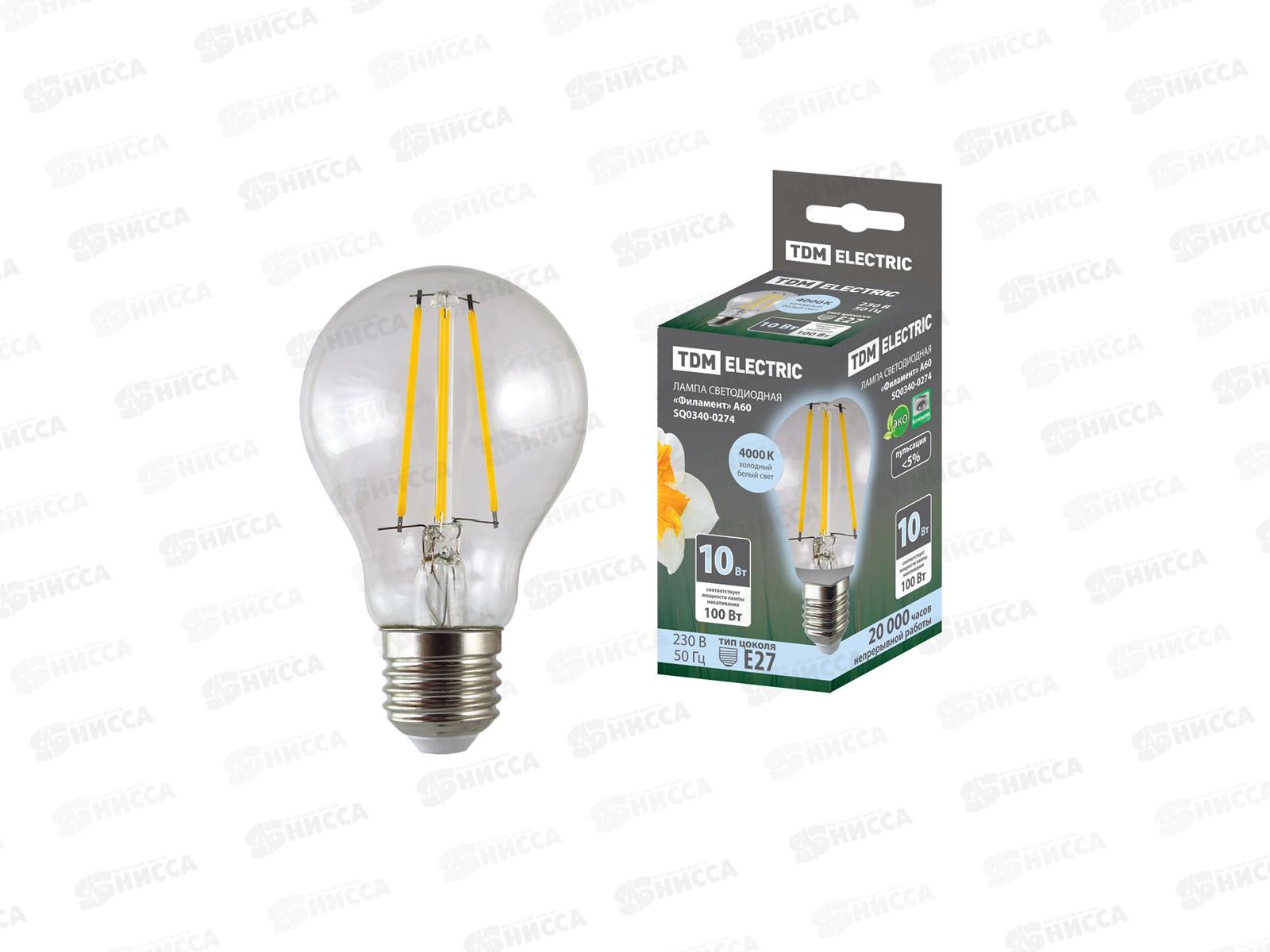 Лампа светодиодная TDM А60-10 Вт-230 В-4000 К–E27 Филамент TDM, 0274
