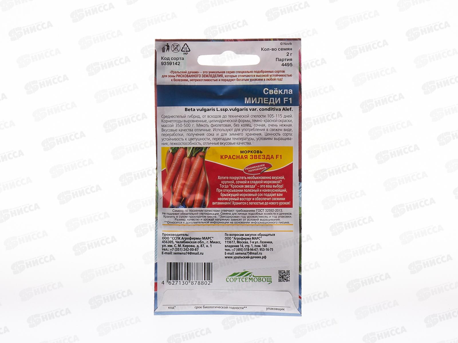 Среднеспелый гибрид, от всходов до технической спелости 105-115 дней. Корнеплоды выровненные, цилиндрической формы, тёмно-красной окраски, массой 350-500 г. Мякоть фиолетовая, без колец, сочная, очень нежная. Вкусовые качества отличные. Используют для употребления в свежем виде, переработки, для получения сока и для зимнего хранения. Ценность гибрида: устойчивость к цветушности, перепадам температур, условиям выращивания, лежкоспособность, отличные вкусовые качества. Свёкла лучше растет на богатых, плодородных почвах с нейтральной реакцией. На тяжёлых почвах её нужно выращивать на грядах. Осенью на участок под свёклу вносят перегной, при необходимости почву известкуют, весной вносят комплексное минеральное удобрение. Семена высевают в конце апреля - начале мая на глубину 2-4 см в рядки, с междурядьями 25-30 см и расстоянием между семенами 8-10 см. Вдальнейшем уход заключается в рыхлении, регулярной подкормке и поливе. Семена свёклы можно высевать под зиму в конце октября - начале ноября.