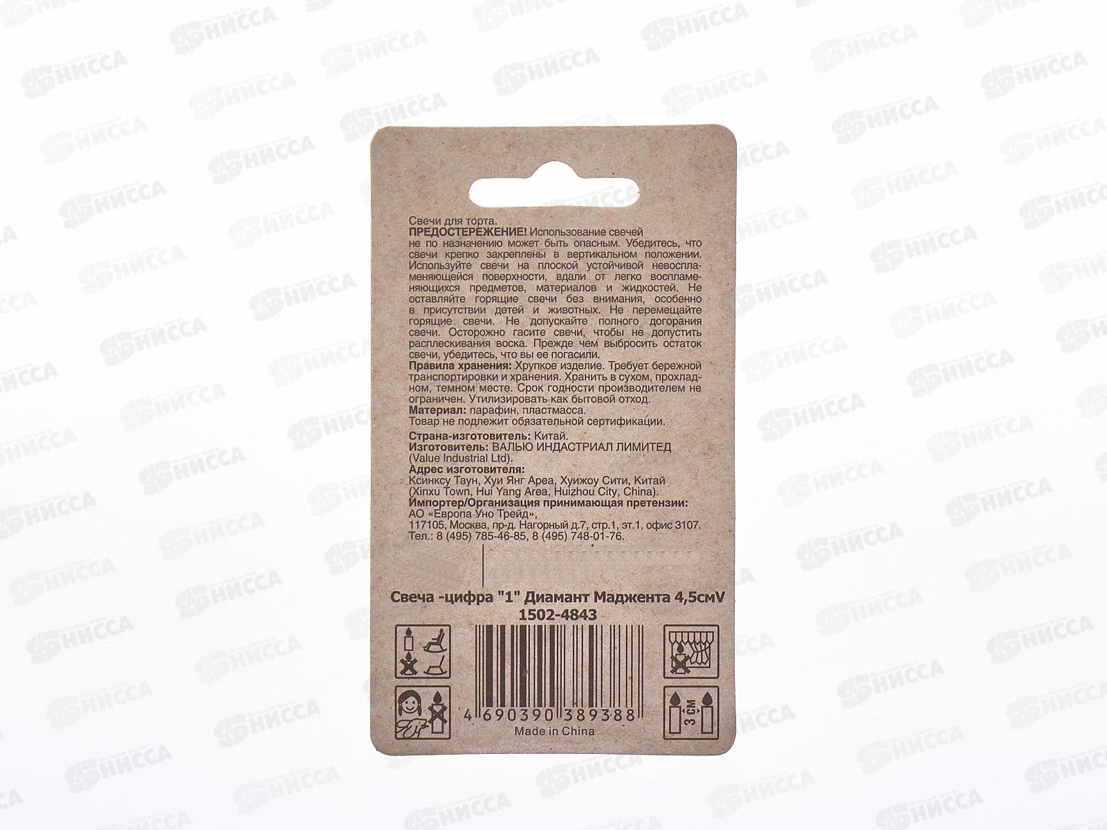 Свеча от Веселая затея "Диамант Манжента", в форме цифры "1". Отличное решение для декорирования торта, десерта ко дню рождения или юбилею. Высота свечи - цифры 4,5 см.