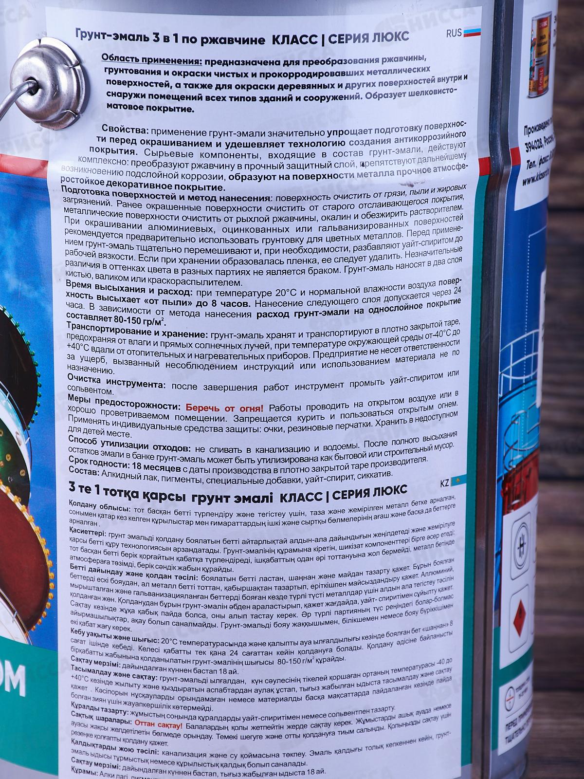 ГРУНТ-ЭМАЛЬ ПО РЖАВЧИНЕ 3 в 1 КЛАСС СЕРИЯ ЛЮКС предназначена для преобразования ржавчины, грунтования и окраски чистых и прокорродировавших металлических поверхностей, а также для окраски деревянных и других поверхностей внутри и снаружи помещений всех типов зданий и сооружений. Образует шелковисто-матовое покрытие. Применение грунт-эмали значительно упрощает подготовку поверхности перед окрашиванием и удешевляет технологию создания антикоррозийного покрытия. Сырьевые компоненты, входящие в состав грунт-эмали, действуют комплексно: преобразуют ржавчину в прочный защитный слой, препятствуют дальнейшему возникновению подслойной коррозии, образуют на поверхности металла прочное атмосферостойкое защитное покрытие.