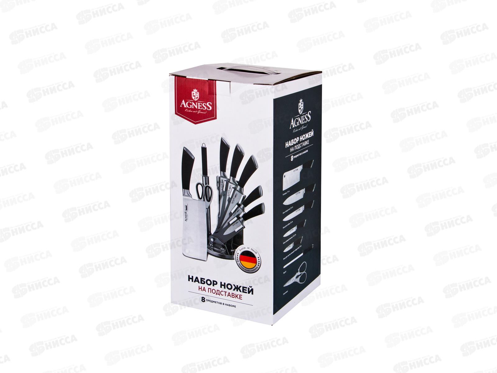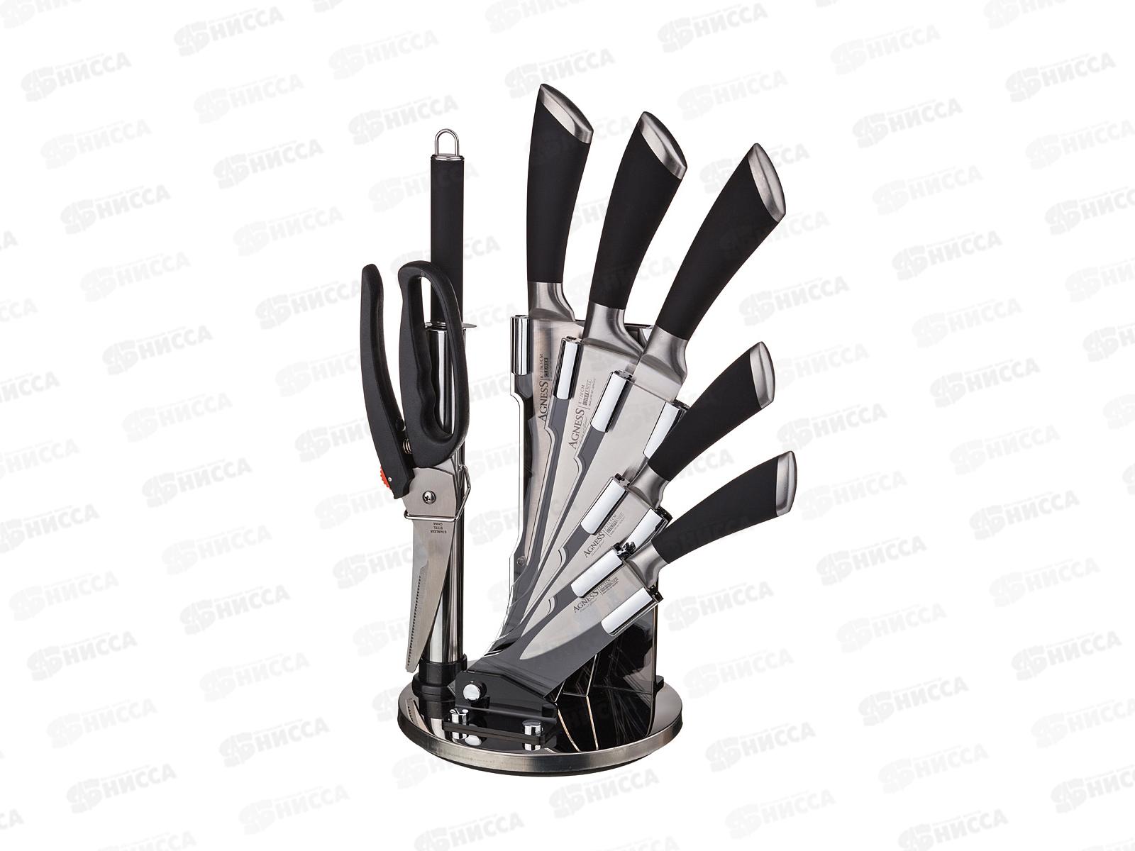 Нож - главный инструмент на кухне, а вернее ножи, т.к. даже самый лучший нож не сможет справиться со всем многообразием задач. Выбирая набор ножей Agness - Вы приобретаете комплект самых необходимых и чаще всего используемых ножей. Преимущества ножей Agness: эргономичная ручка с покрытием Soft Touch для удобной нарезки, лезвие из высокоуглеродистой коррозионной стали, 2-х стороняя заточка лезвия, удобная вращающаяся подставка. Для экономии рабочего пространства Вы легко можете сложить подставку. Состав набора: топорик 17 см, нож поварской 20 см, нож для нарезки 20 см, нож универсальный 12,5 см, нож для чистки овощей и фруктов 9 см, мусат, ножницы для птицы, складывающаяся подставка. Рекомендована ручная мойка.