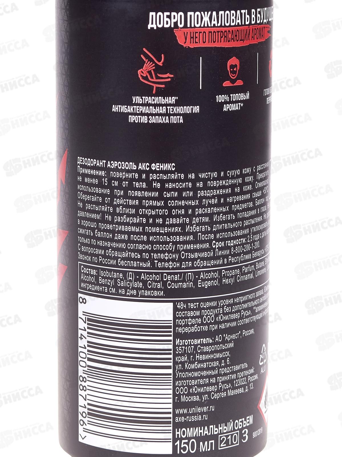 Легендарный AXE Phoenix с бодрящими нотами арктической мяты и освежающих трав оставляет привлекательный шлейф, а упаковка в стильном ярком дизайне так и просится в руки. С AXE Phoenix ты уверен в себе весь день, каждый день и в любой ситуации. Будь то свидание с той самой или тренировка. AXE Phoenix не оставляет следов и пятен на одежде и не блокирует потовые железы. Дезодорант для мужчин AXE имеет формулу с антибактериальным эффектом ZINC ZAP на основе цинка, а это значит, препятствует появлению неприятного запаха. Не содержит солей алюминия.
