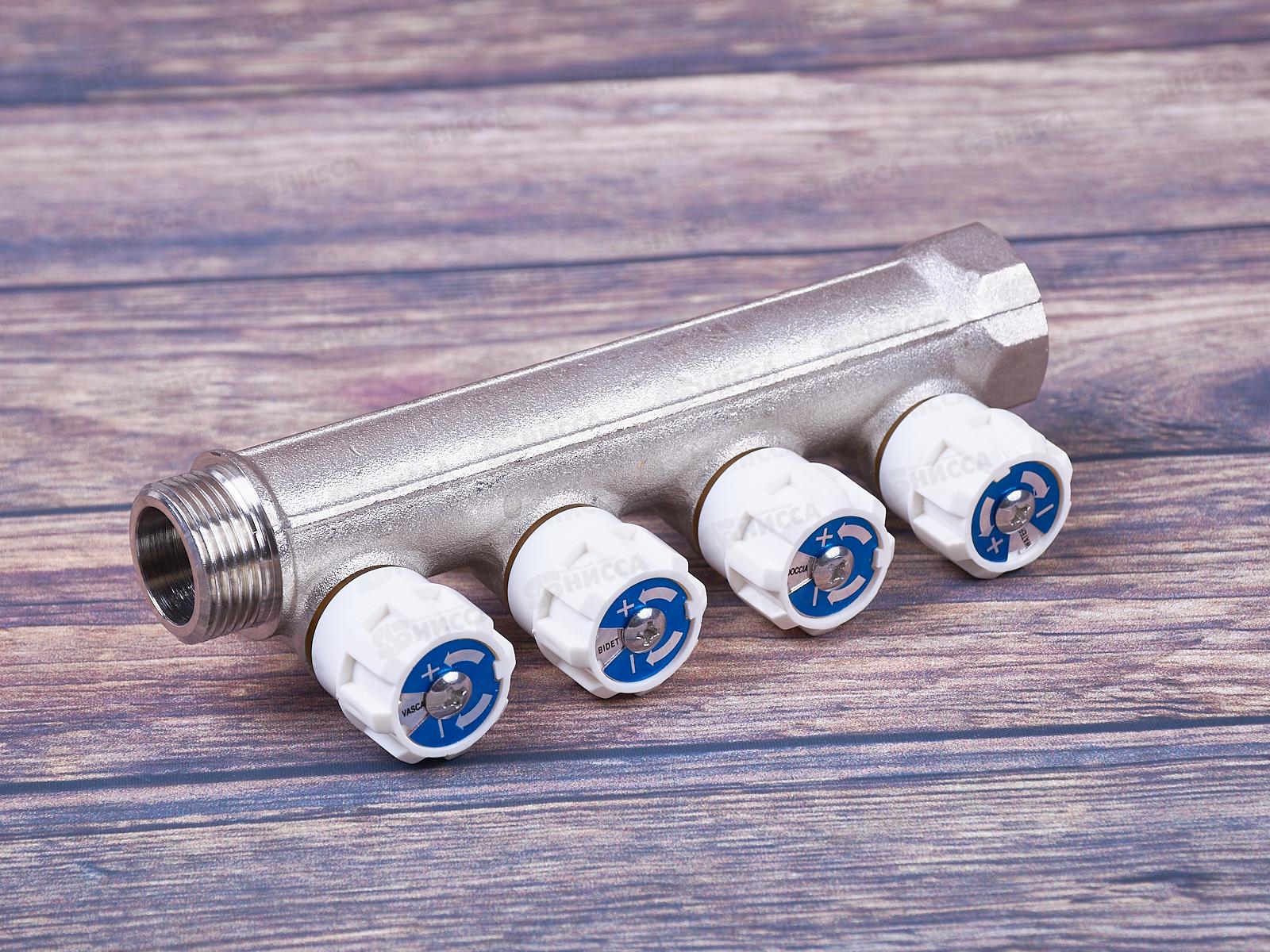 Коллектор резьбовой Aqualink 04478 4 выхода с вентилями с внутренней и наружной резьбой 3/4х1/2 дюйма используется для распределения и регулирования рабочей среды в системах горячего и холодного хозяйственно-питьевого водоснабжения, а также отопления: системы «теплый пол» и радиаторного отопления.