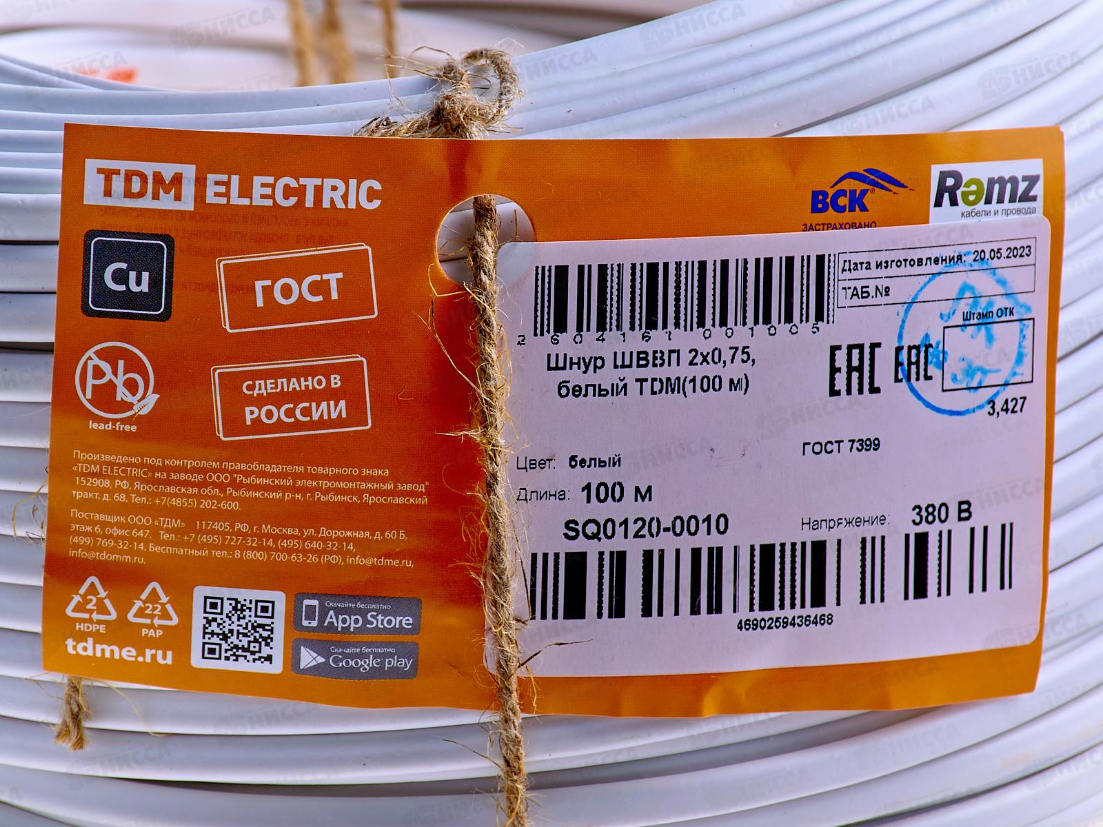 Провод ШВВП 2*0,75кв.мм белый, ГОСТ, TDM, 0010 *100
