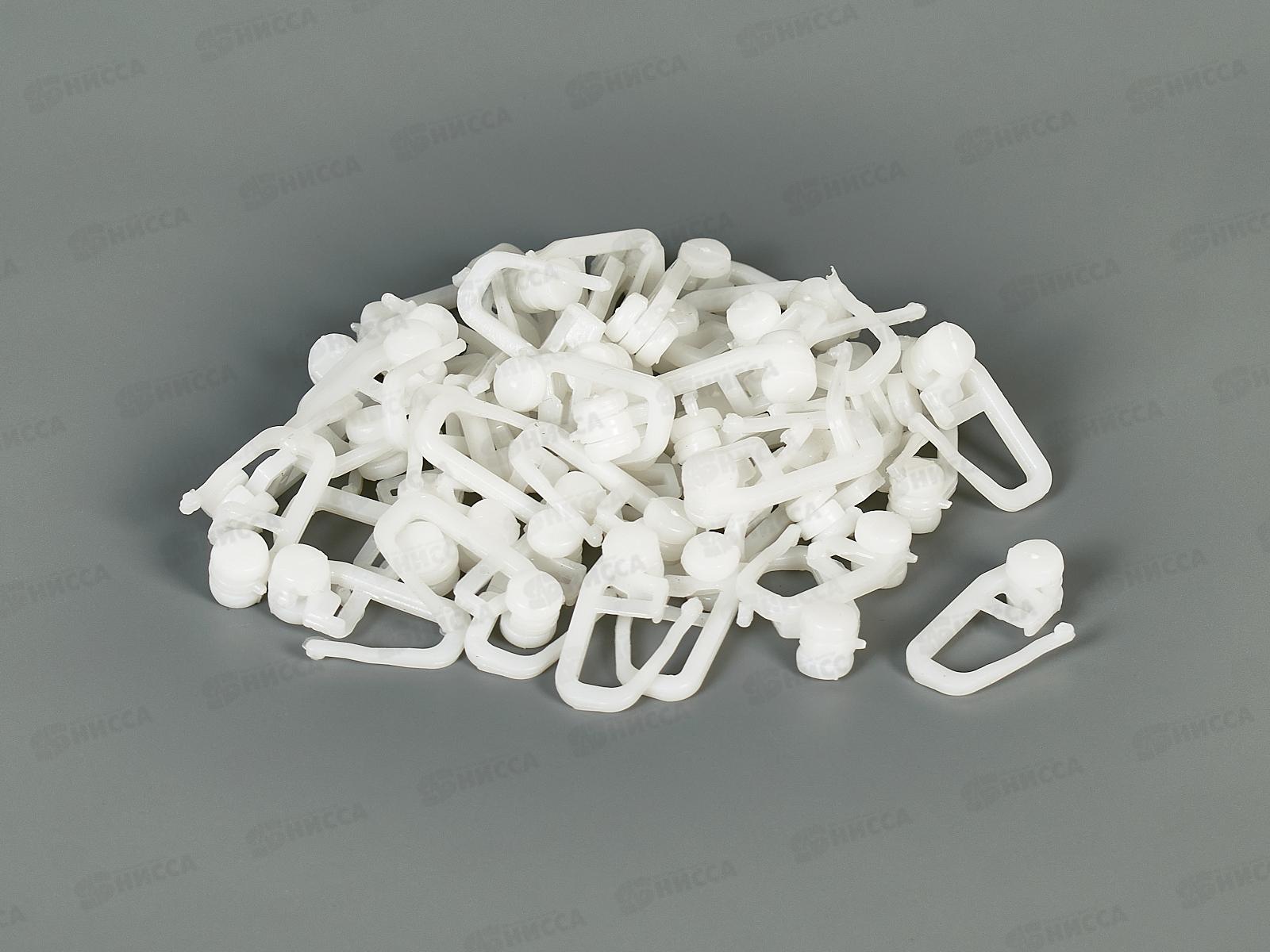 Комплект крючков для потолочных пластиковых карнизов. Обеспечивают фиксацию шторы и бесшумное скольжение по направляющим карниза. В комплекте 50 крючков