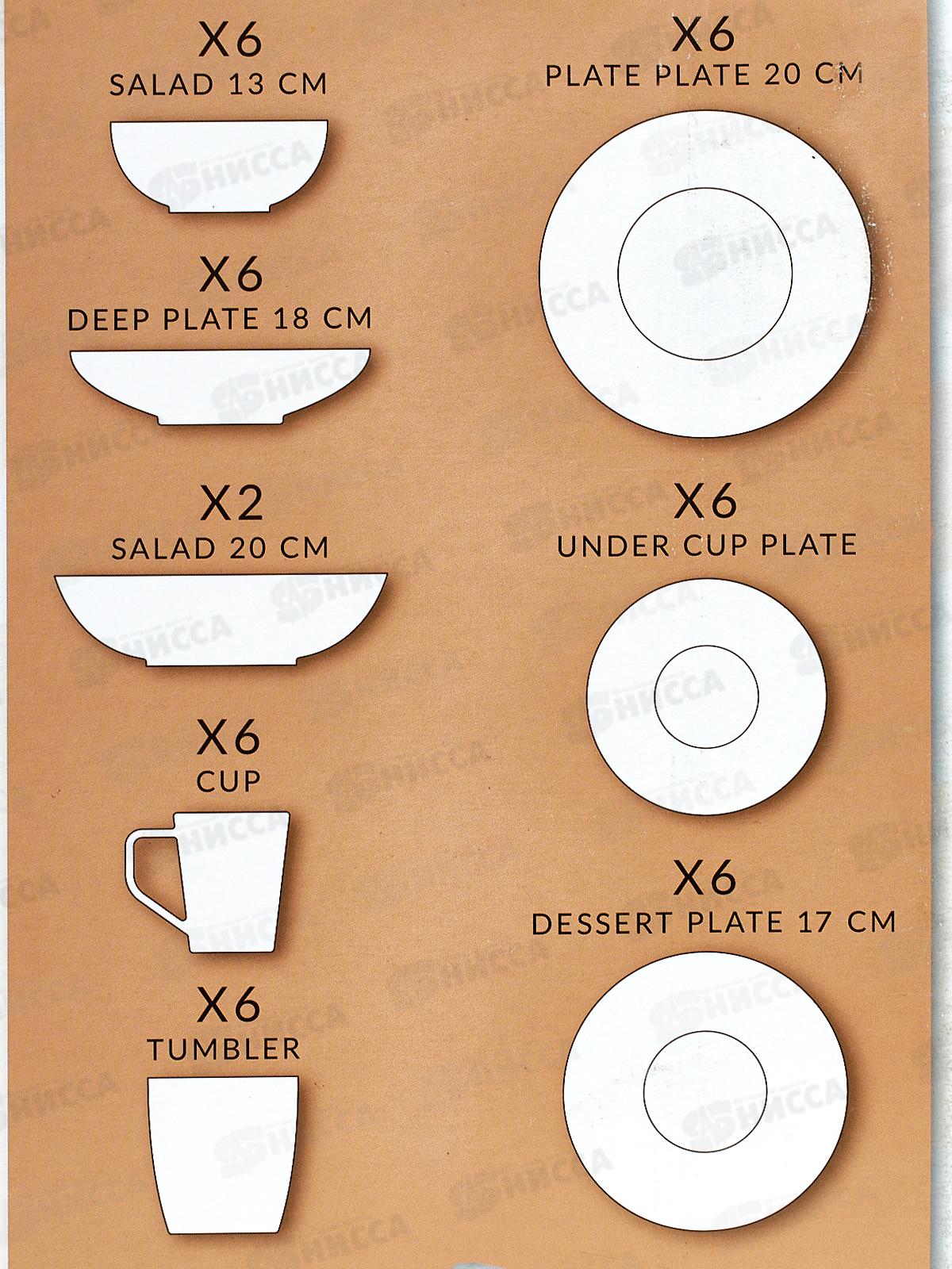 В столовый набор "Elica" входит 44 предмета. Нейтральное цветовое решение сочетается с любым интерьером. Идеально подойдет как для ежедневного использования, так и для сервировки праздничного стола. Материал столовой посуды отличается стойкостью и долговечностью. Комплект можно мыть в посудомоечной машине и можно использовать в СВЧ-печи. Состав набора: - тарелка диаметр 20 см - 6 шт, десерная тарелка (диаметр 17 см) - 6 шт, блюдце - 6 шт, кружка - 6 шт, стакан - 6 шт, салатник 13 см - 6 шт, салатник 18 см - 6 шт, салатник 20 см - 2 шт.
