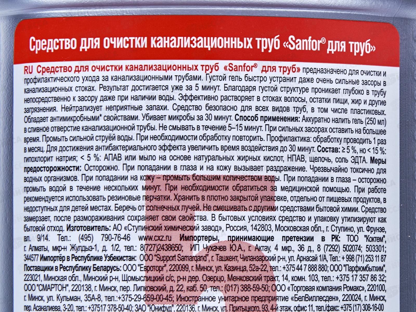 САНФОР гель для прочистки канализационных труб 1000г 1957*10