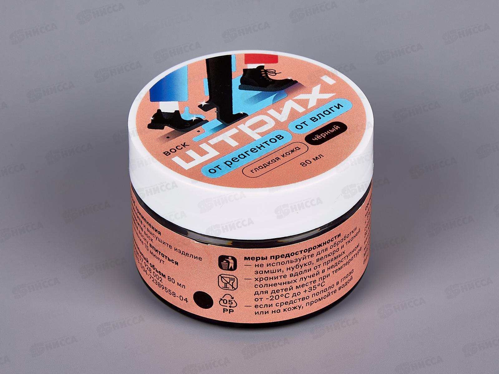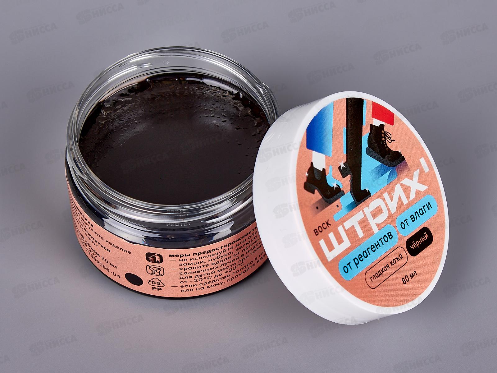 Черный воск от реагентов и влаги от бренда Штрих. Новая формула восковой композиции на основе натурального пчелиного воска разработана специально для гладких кож, с учетом негативных погодных условий, в которых эксплуатируется обувь. Эффективно предохраняет обувь от намокания, защищает от соли, снега и морозов. Входящие в состав природные жиры и масла бережно увлажняют и смягчают кожу обуви. Подходит для спортивной и туристической кожаной обуви.