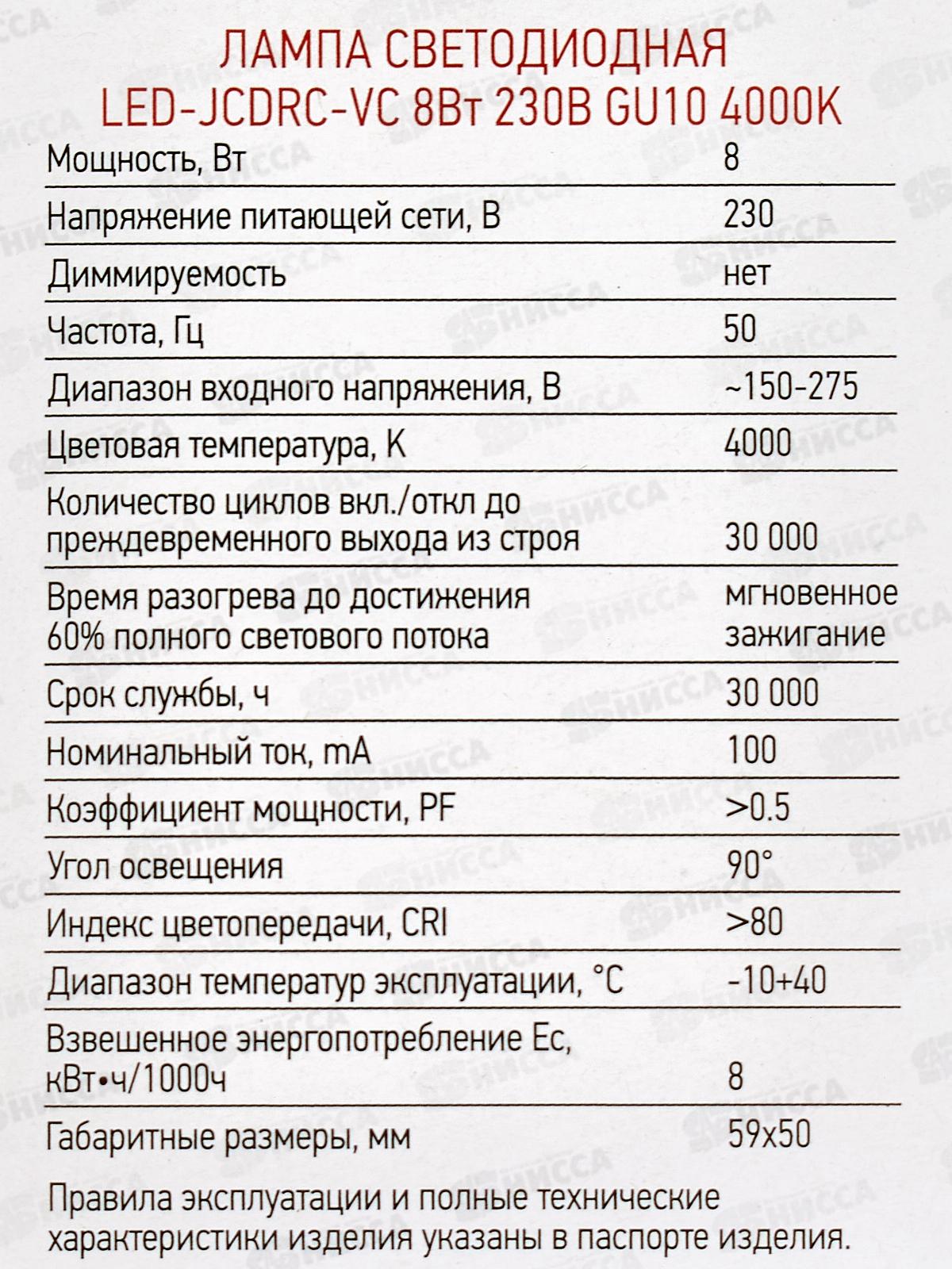 Лампа светодиодная IN-HOME LED-JCDRС-VC 8Вт 230В GU10 4000К 720Лм *50