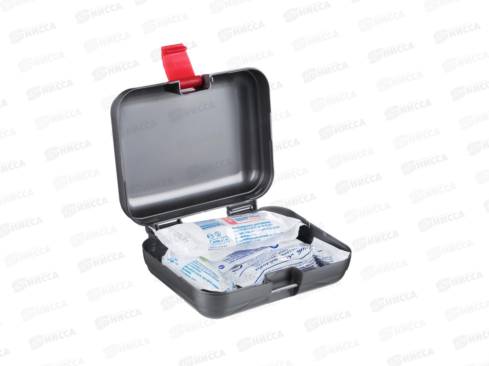 Состав: жгут кровоостанавливающий - 1 шт. Бинт марлевый медицинский нестерильный 5 м х 5 см - 1 шт. Бинт марлевый медицинский нестерильный 5 м х 7 см - 1 шт. Лейкопластырь бактерицидный 1,9 см х 7,2 см - 2 шт. Лейкопластырь бактерицидный 4 см х 10 см - 1 шт. Устройства для проведения искусственного дыхания "Рот-устройство-рот" - 1 шт. Пластиковый кейс с защелками (14х12,5х6 см) - 1 шт.