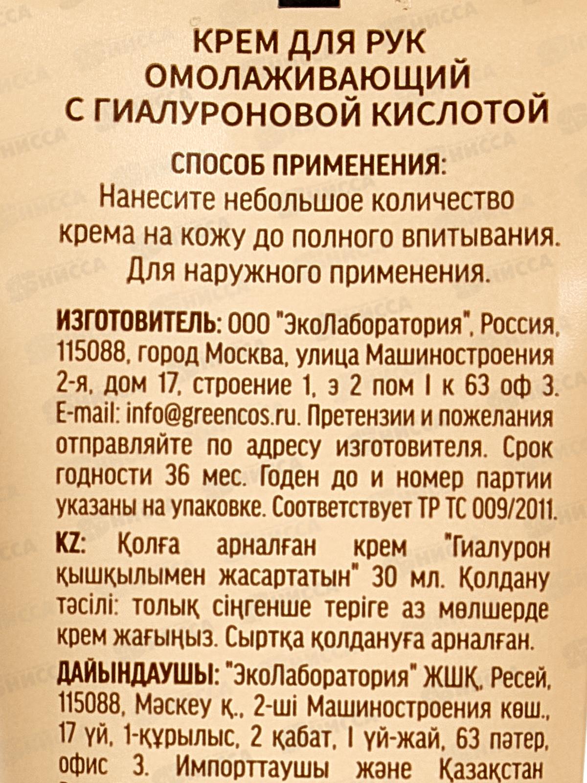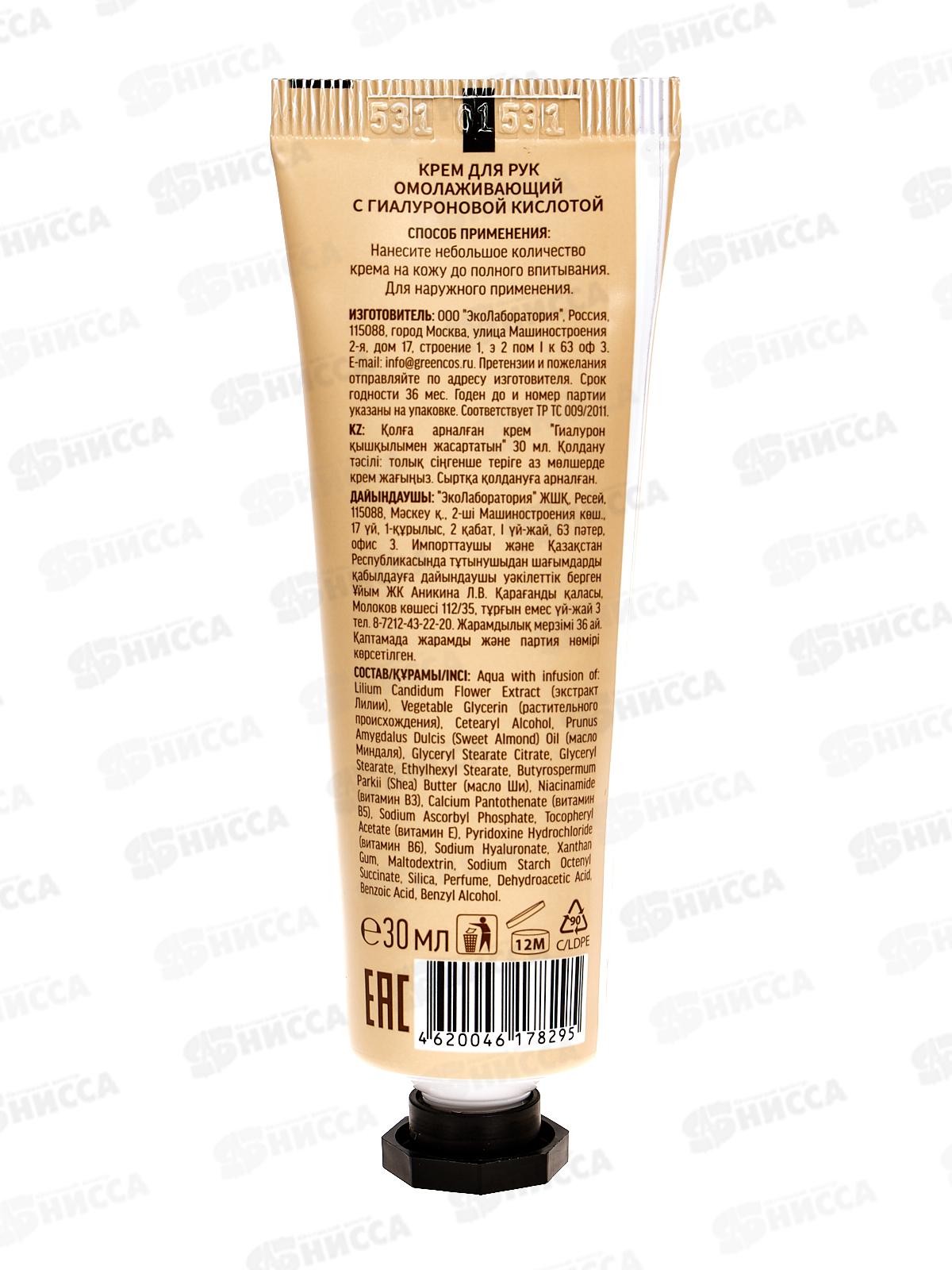 ЭкоЛаборатория Крем для рук Омолаживающий с гиалуроновой кислотой 30мл 214207 *20