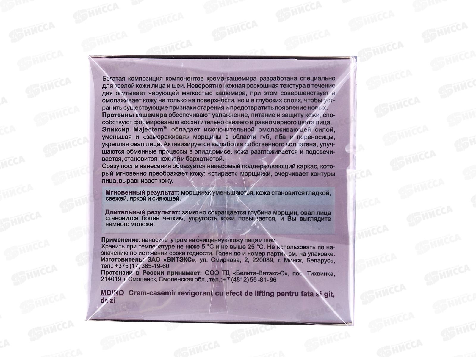 Богатая композиция компонентов крема-кашемира разработана специально для зрелой кожи лица и шеи. Невероятно нежная роскошная текстура в течение дня окутывает чарующей мягкостью кашемира, при этом совершенствует и омолаживает кожу не только на поверхности, но и в глубоких слоях, чтобы устранить существующие признаки старения и предотвратить появление новых. Протеины кашемира обеспечивают увлажнение, питание и защиту кожи, способствуют формированию восхитительно свежего и равномерного цвета лица. Эликсир Majestemтм обладает исключительной омолаживающей силой, уменьшая и «замораживая» морщины в области губ, лба и переносицы, укрепляя овал лица. Активизируется выработка собственного коллагена, улучшаются обменные процессы в эпидермисе, кожа разглаживается и подсвечивается, становится нежной и бархатистой. Сразу после нанесения образуется невесомый поддерживающий каркас, который мгновенно преображает кожу: «стирает» морщинки, очерчивает контуры лица, выравнивает кожу.