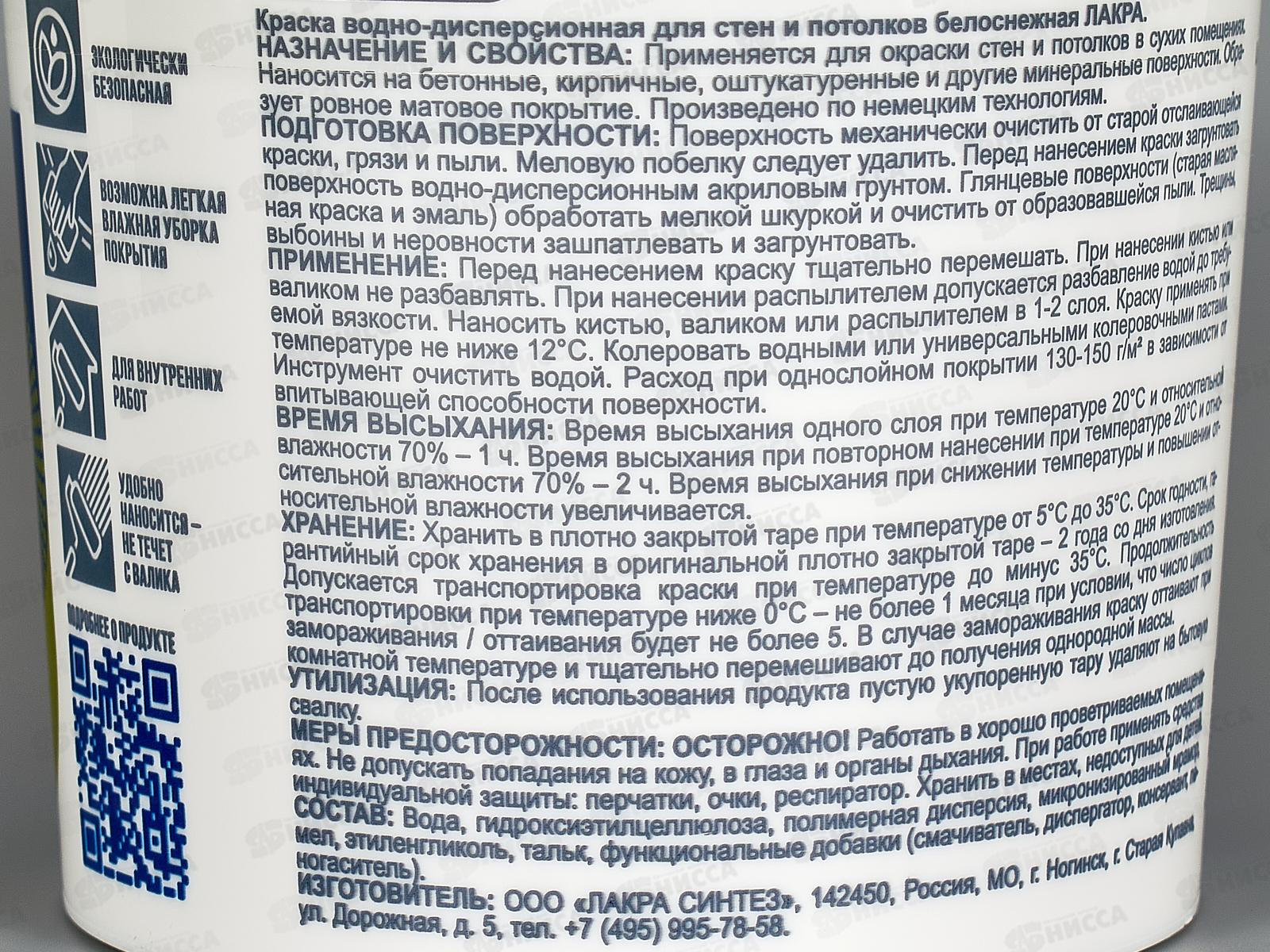 Краска акриловая для стен и потолков Лакра белоснежная 1,3кг, 8306468 *12/432