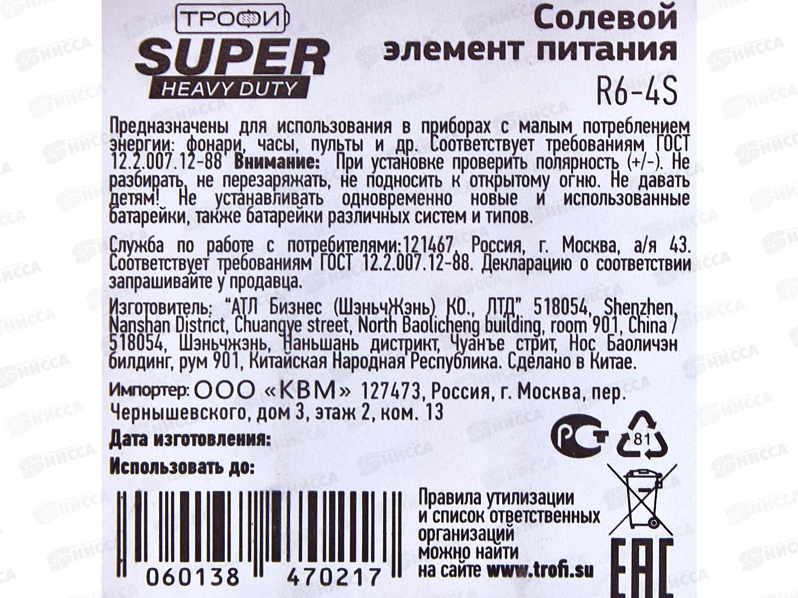 Солевые (цинковые) батарейки Трофи R6, 4 шт. Батарейки предназначены для питания устройств с умеренным и распределенным во времени потреблением энергии: пульты дистанционного управления, часы, бытовые светодиодные фонари и др. Классический блистер на 4 батарейки.