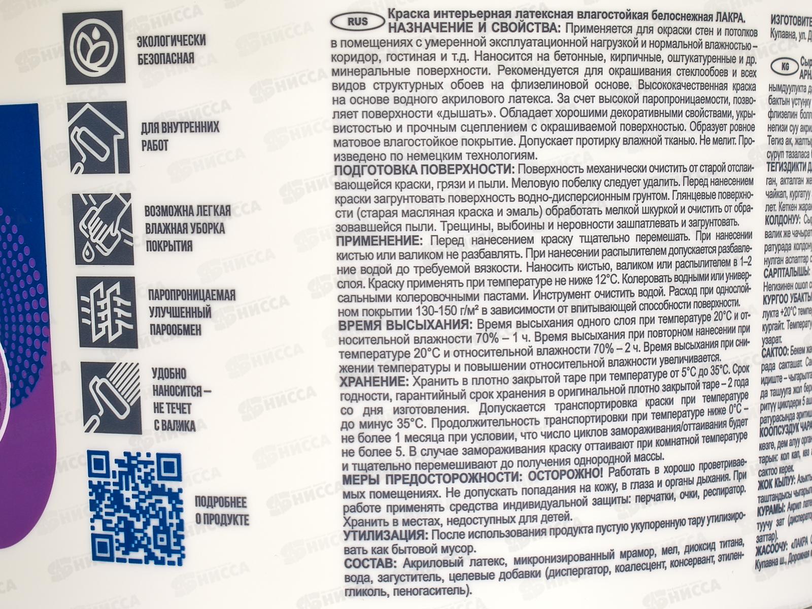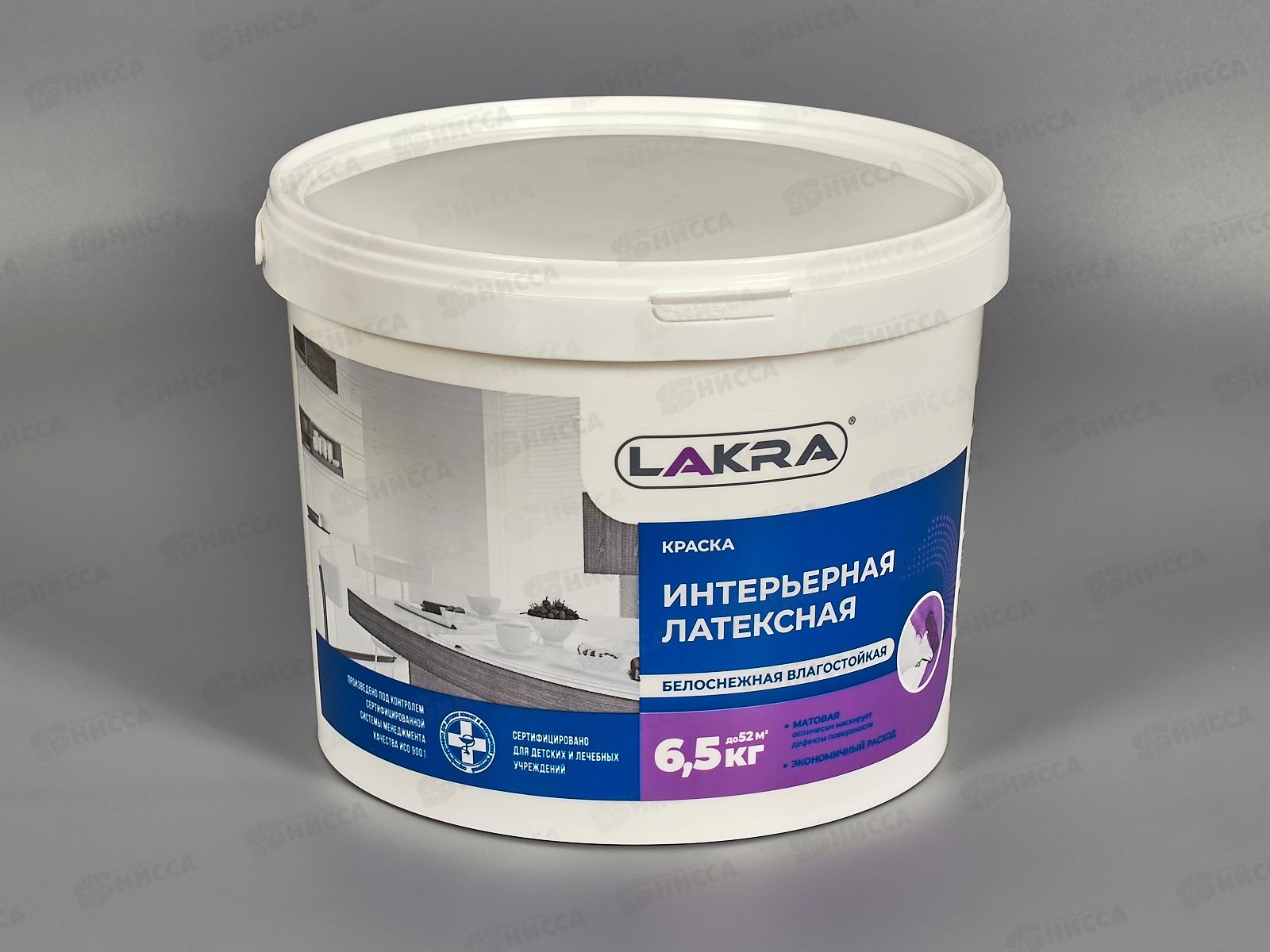 Краска интерьерная латексная влагостойкая белоснежная 6,5кг, Лакра, 8306477 *72