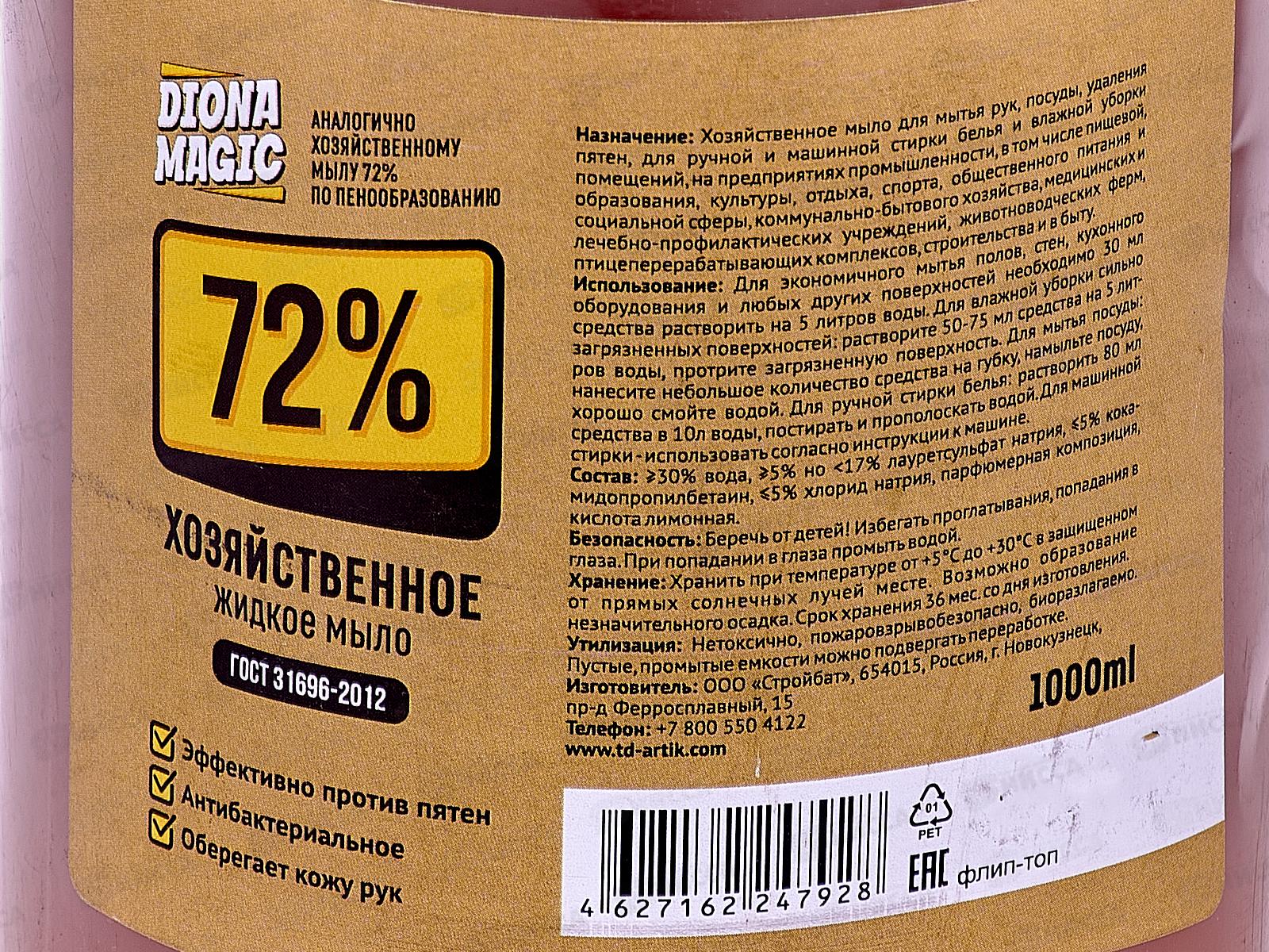Хозяйственное мыло для мытья рук, посуды, удаления пятен, для ручной и машинной стирки белья и влажной уборки помещений, на предприятиях промышленности, в том числе пищевой, образования, культуры, отдыха, спорта, общественного питания и социальной сферы, коммунально-бытового хозяйства, медицинских и лечебно-профилактических учреждений, животноводческих ферм, птицеперерабатывающих комплексов, строительства и в быту. Состав: ?30% Вода, ?5% но ?17% Лауретсульфат натрия, ?5% Кокамидопропилбетаин, ?5% Хлорид натрия, Парфюмерная композиция, Кислота лимонная.