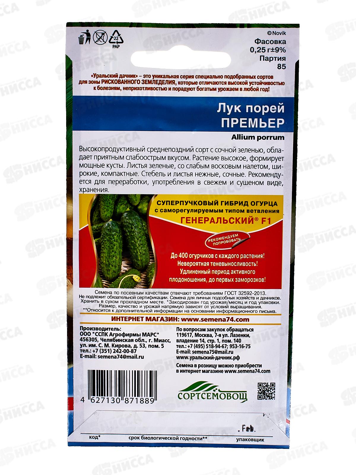 Лук порей Премьер - высокопродуктивный, среднепоздний сорт с сочной зеленью, обладает приятным, слабоострым вкусом. Растение высокое, формирует мощные кусты. Листья зелёные, со слабым восковым налетом, широкие, компактные. Стебель и листья нежные, сочные. Рекомендуется для переработки, потребления в свежем и сушеном виде, хранения.