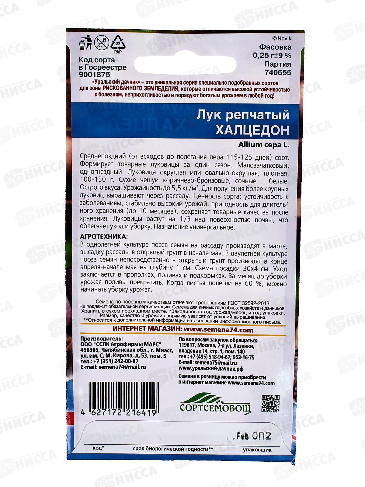 Лук репчатый Халцедон - среднепоздний (от всходов до полегания пера 115-125 дней) сорт. Формирует товарные луковицы за один сезон. Малозачатковый, одногнездный. Луковица округлая или овально-округлая, плотная, 100-150 г. Сухие чешуи коричнево-бронзовые, сочные – белые. Острого вкуса. Урожайность до 5,5 кг/м2. Для получения более крупных луковиц выращивается через рассаду. Ценность сорта: устойчивость к заболеваниям, стабильно высокий урожай, пригодность для длительного хранения (до 10 месяцев), сохраняет товарные качества после хранения. Луковицы растут на 1/3 над поверхностью почвы, что облегчает уход и уборку. Назначение универсальное. В однолетней культуре посев семян на рассаду производят в марте, высадку рассады в открытый грунт в начале мая. В двулетней культуре посев семян непосредственно в открытый грунт производят в конце апреля-начале мая, на глубину 1 см. Схема посадки 30х4 см. Уход заключается в прополках, поливах и подкормках. За месяц до уборки урожая поливы прекратить. Когда листья полегли на 60 %, можно начинать уборку урожая.