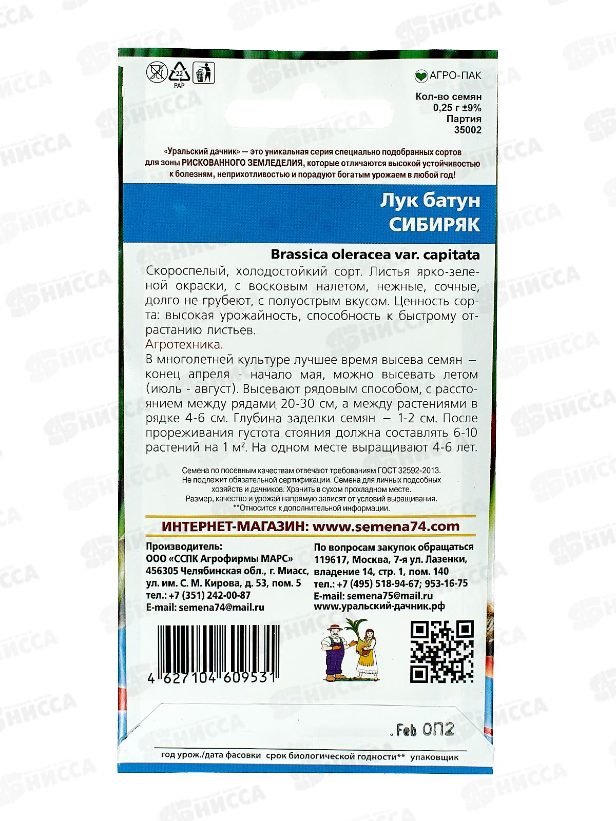 Лук батун Сибиряк - скороспелый холодостойкий сорт. Листья ярко-зелёной окраски, с восковым налётом, нежные, сочные, долго не грубеют, с полуострым вкусом. Ценность сорта: высокая урожайность, способность к быстрому отрастанию листьев. В многолетней культуре лучшее время высева семян — конец апреля-начало мая, можно высевать летом (июль-август). Высевают рядовым способом, с расстоянием между рядами 20-30 см, а между растениями в грядке 4-6 см. Глубина заделки семян — 1-2 см. После прореживания густота стояния должна составлять 6-10 растений на 1 м2. На одном месте выращивают 4-6 лет.
