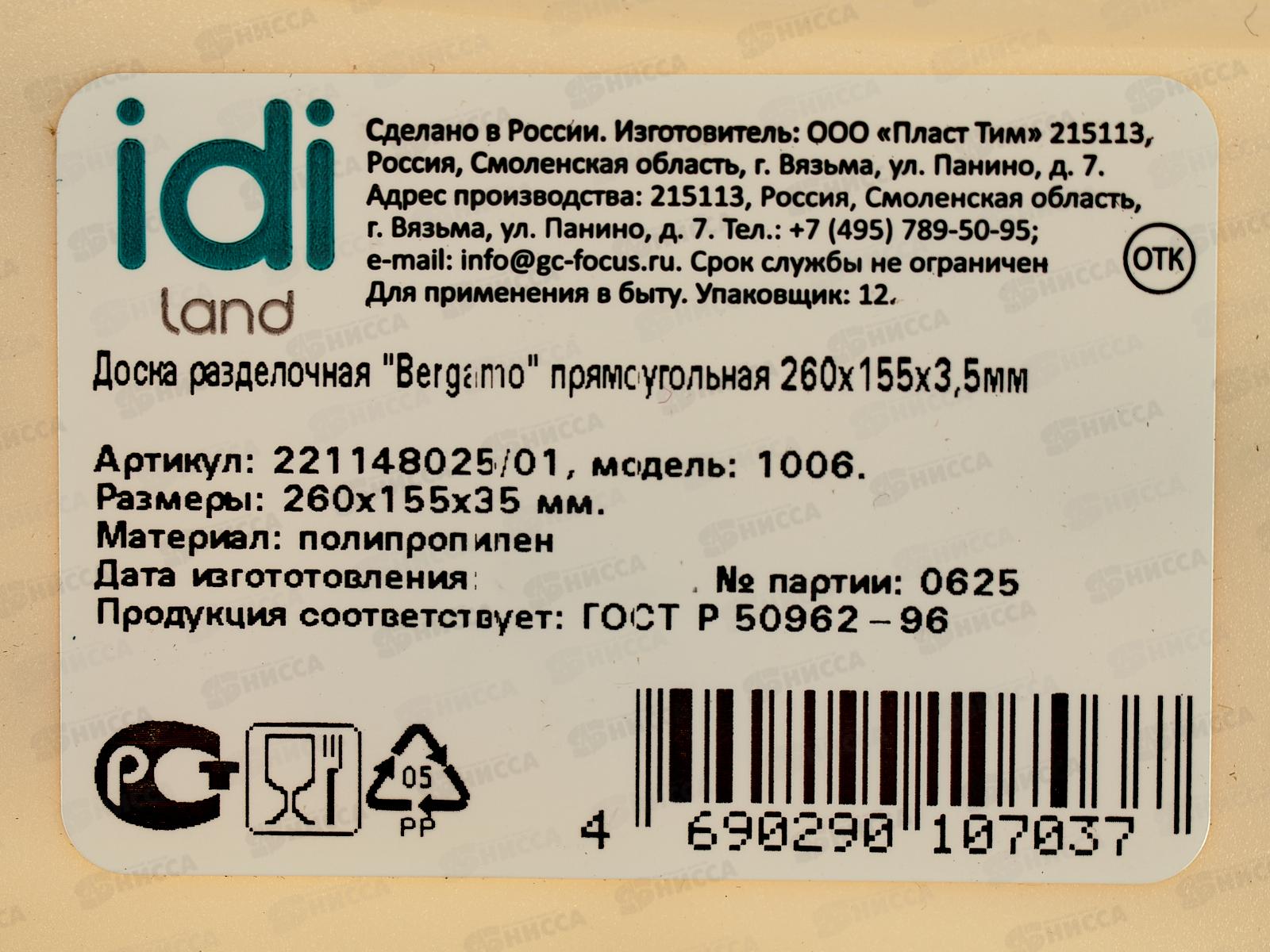 Доска разделочная "Bergamo" прямоугольная 260*155*3,5мм светло-бежевая 221148025/01 *20