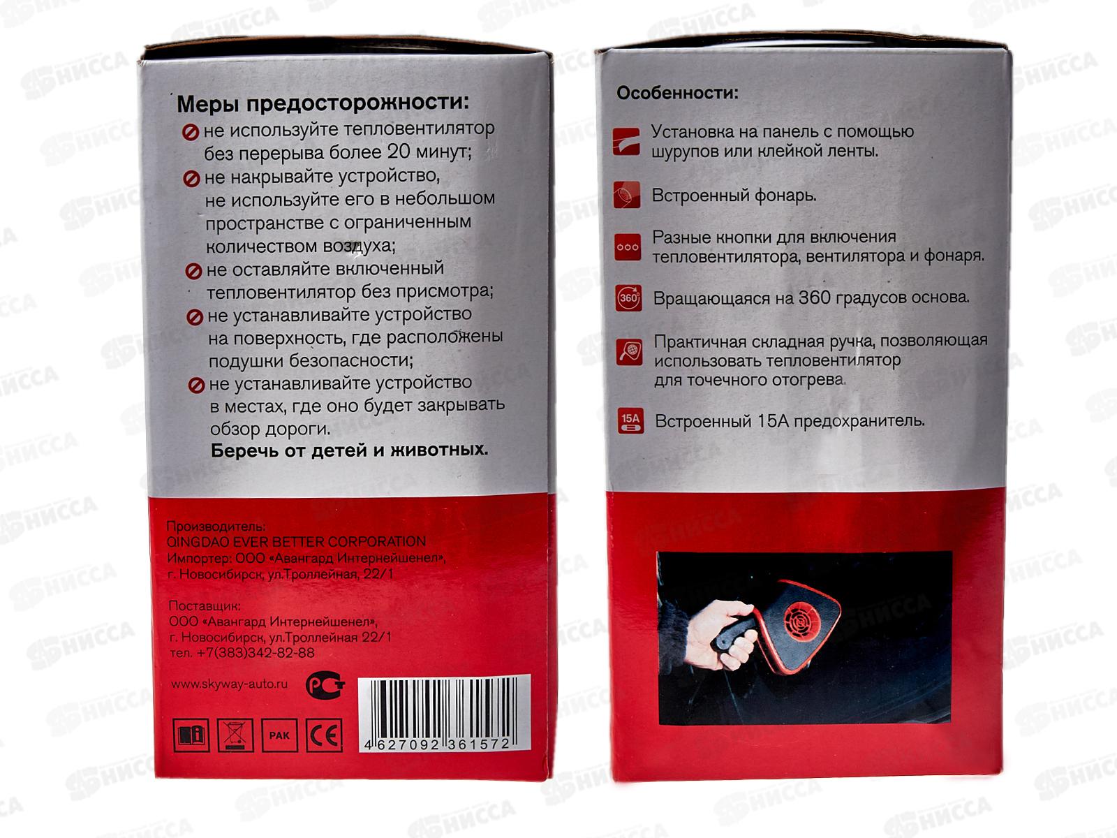 Тепловентилятор 12V SKYWAY в прикуриватель с фонарем черно-красный – предназначен для прогрева салона автомобиля. Незаменимый прибор в зимнее время. Способствует быстрому оттаиванию замерзших стекол. Практичная складная ручка позволяет использовать тепловентилятор для точечного отогрева.