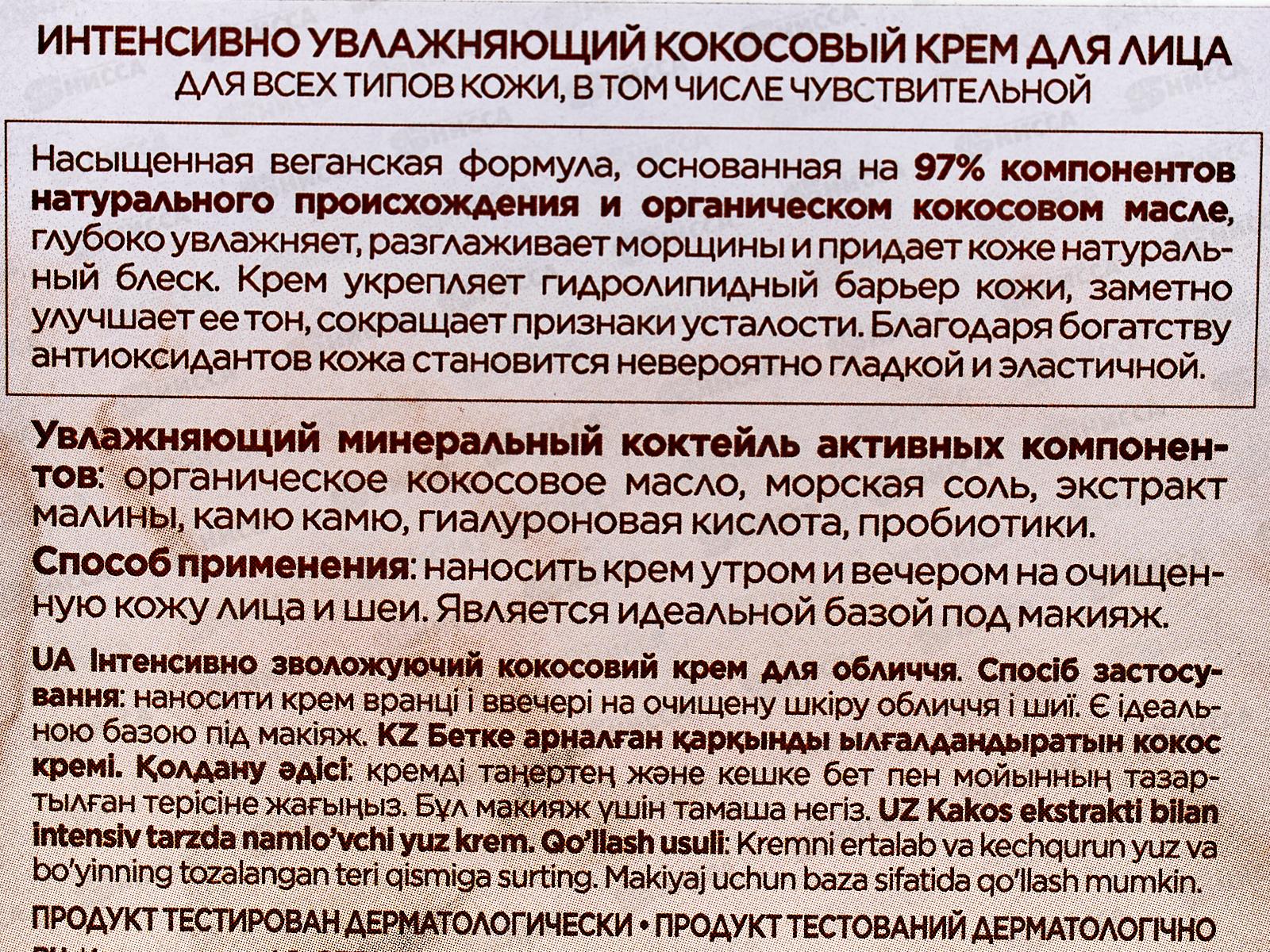 Насыщенная веганская формула, основанная на 97% компонентов натурального происхождения и органическом кокосовом масле, глубоко увлажняет, разглаживает морщины и придает коже натуральный блеск. Крем укрепляет гидролипидный барьер кожи и улучшает ее тон, сокращает признаки усталости. Благодаря богатству антиоксидантов кожа становится невероятно гладкой и эластичной. Состав: Aqua (Water), Butyrospermum Parkii Butter, Caprylic/Capric Triglyceride, Cetyl Alcohol, Glyceryl Stearates, Glycerin, Disodium Cetearyl Sulfosuccinate, Myristyl Myristate, Prunus Amygdalus Dulcis Oil, Cocos Nucifera Oil, Rubus Idaeus Seed Oil, Helianthus Annuus Seed Wax, Mangifera Indica Seed Butter, Tripelargonin, Aloe Barbadensis Leaf Juice, Lycium Barbarum Fruit Extract, Polymnia Sonchifolia Root Juice, Betaine, Alpha-Glucan Oligosaccharide, Lactobacillus, Tocopheryl Acetate, Parfum (Fragrance), Phenoxyethanol, Hydroxyacetophenone, Ethylhexylglycerin, Potassium Sorbate, Sodium Benzoate, Acrylates/C10-30 Alkyl Acrylate Crosspolymer, Triethanolamine, Tapioca Starch, Maltodextrin, Sorbic Acid, Coumarin.