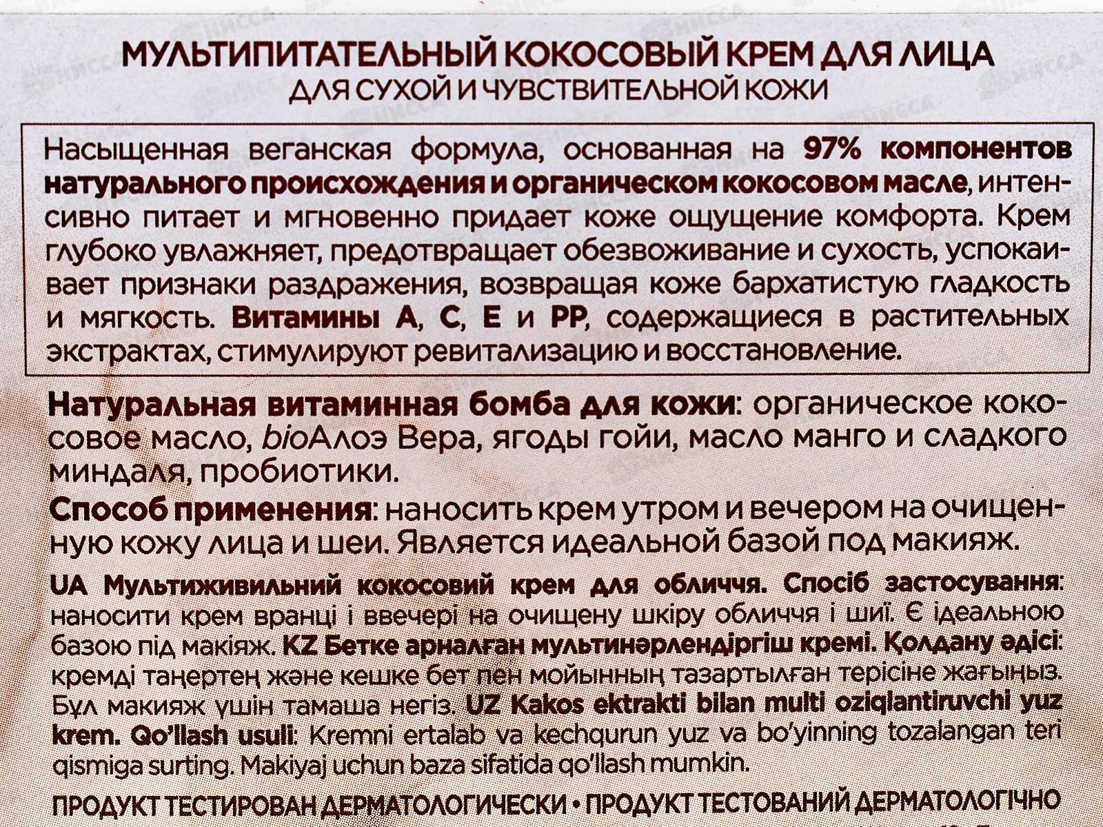 Насыщенная веганская формула, основанная на 97% компонентов натурального происхождения и органическом кокосовом масле, интенсивно питает и мгновенно возвращает ощущение комфорта. Крем эффективно предотвращает обезвоживание и сухость, глубоко увлажняет и успокаивает признаки раздражения, придавая коже бархатистую гладкость и мягкость. Витамины A, C, E и PP, содержащиеся в растительных экстрактах, стимулируют ревитализацию и восстановление. Состав: Aqua (Вода), Масло Butyrospermum Parkii, Каприловый/каприновый триглицерид, Цетиловый спирт, Глицерилстеараты, миристилмиристат, Глицерин, Динатриевый цетеарилсульфосукцинат, октилдодеканол, Масло кокосового ореха, Масло семян ежевики обыкновенной, Сок корня Polymnia Sonchifolia, экстракт плодов Myrciaria Dubia, гиалуронат натрия, Бетаин, Марис Сал, Альфа-Олигосахарид глюкана, лактобактерии, токоферилацетат, феноксиэтанол, гидроксиацетофенон, Этилгексилглицерин, Сорбат калия, бензоат натрия, Парфюмерия (отдушка), Акрилаты/Кроссполимер алкилакрилата С10-30, триэтаноламин, Крахмал тапиоки, Лимонная кислота, мальтодекстрин, Кумарин.
