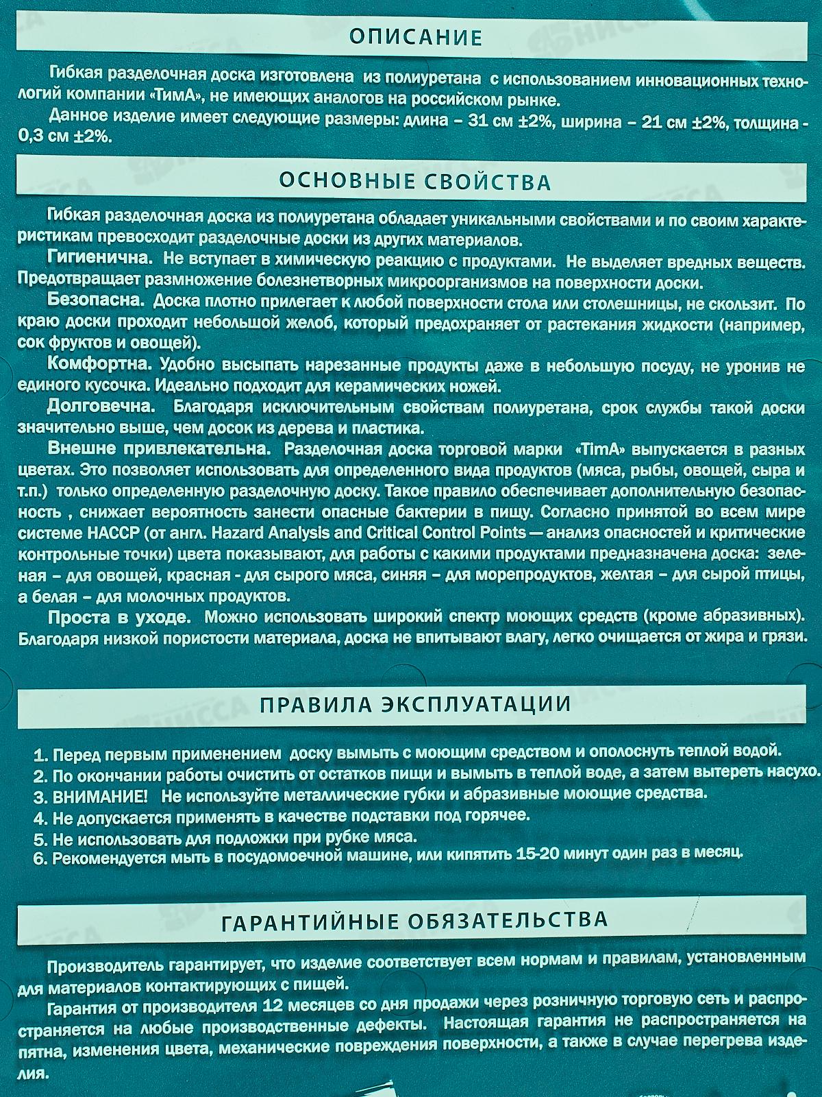 Разделочная доска из полиуретана - собственная инновационная разработка компании «TimA», не имеющая аналогов на российском рынке. Она обладает уникальными свойствами и по своим характеристикам превосходит разделочные доски из любых других материалов. Не вступает в химическую реакцию с продуктами. Благодаря отсутствию пористости полиуретана, болезнетворные микроорганизмы (бактерии, грибки плесени и запахи) легко удаляются с поверхности, в отличие от деревянных разделочных досок. А специальная добавка с активными ионами серебра убивает все известные бактерии и микроорганизмы уже на стадии нарезки продуктов. При резке лезвие ножа взаимодействует с упругой эластичной поверхностью, что сохраняет остроту ножа (в отличие от разделочных досок из других материалов). Доска плотно прилегает к любой поверхности стола или столешницы, не скользит. При работе с острым ножом это очень важно в плане безопасности. По краю доски проходит небольшой желоб, который предохраняет от растекания жидкости (например, сок фруктов и овощей). Благодаря исключительным свойствам полиуретана, срок службы такой доски значительно выше, чем досок из дерева и пластика. Единственные ограничения для досок из полиуретана – не использовать их как подложку для рубки мяса или подставку под горячее. Разделочную доску можно мыть в посудомоечной машине. Можно использовать широкий спектр моющих средств (кроме абразивных). Доска абсолютно не впитывают влагу и запахи продуктов, легко очищается от жира и грязи.