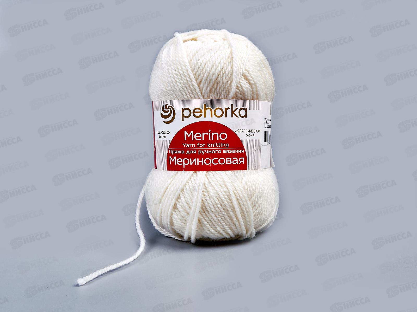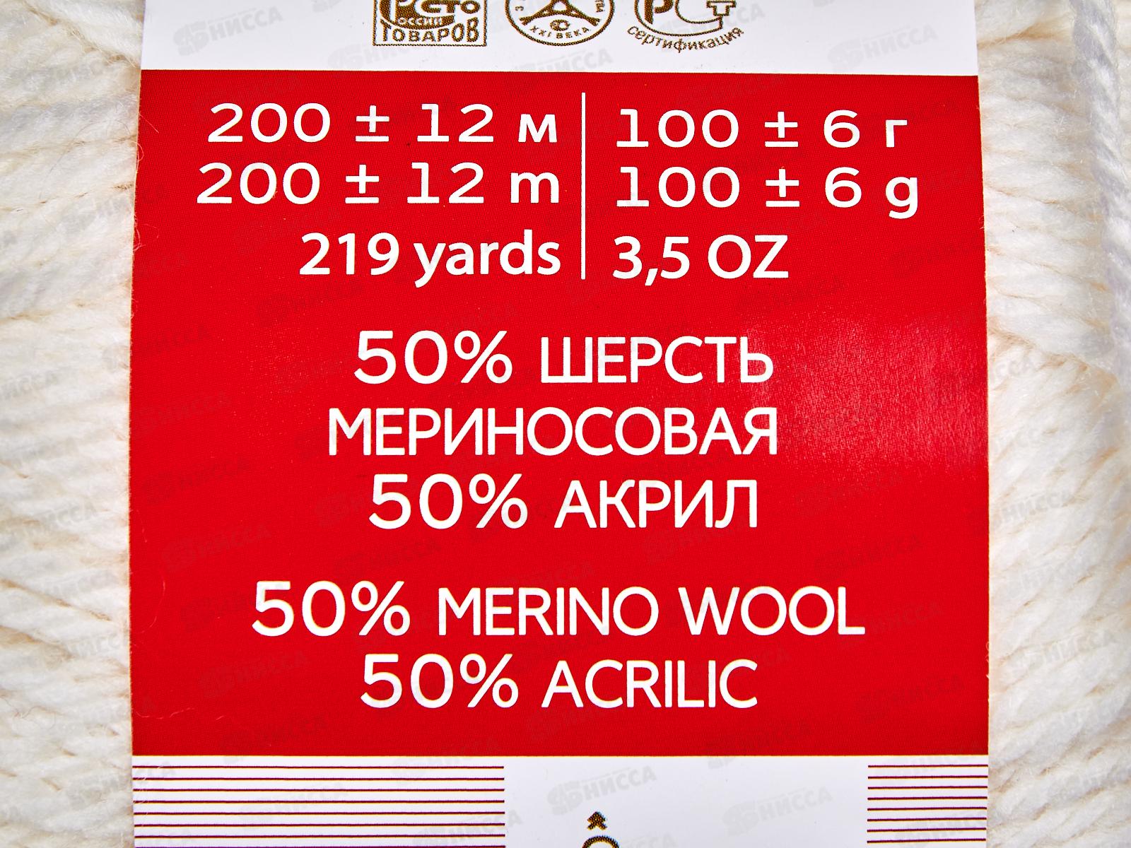Пряжа Мериносовая 01 белый 100г шерсть50% акр50%