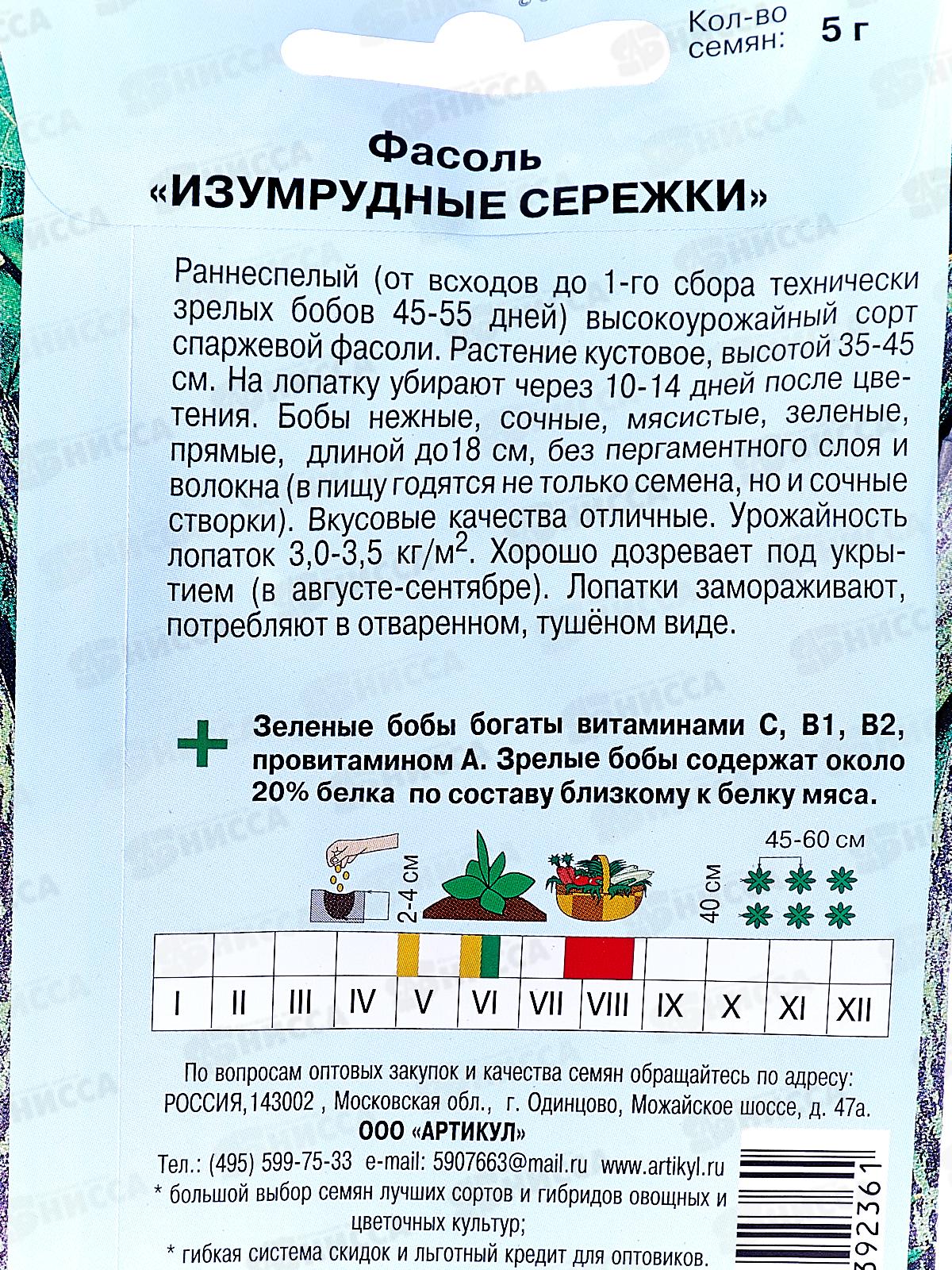 Фасоль "Изумрудные сережки" - раннеспелый (от всходов до 1-го сбора технически зрелых бобов 45-55 дней) высокоурожайный сорт спаржевой фасоли. Растение кустовое, высотой 35-45 см. На лопатку убирают через 10-14 дней после цветения. Бобы нежные, сочные, мясистые, зеленые, прямые, длиной до18 см, без пергаментного слоя и волокна (в пищу годятся не только семена, но и сочные створки). Вкусовые качества отличные. Урожайность лопаток 3,0-3,5 кг/м2. Хорошо дозревает под укрытием (в августе-сентябре). Лопатки замораживают, потребляют в отваренном, тушёном виде. Зеленые бобы богаты витаминами С, В1, В2, провитамином А. Зрелые бобы содержат около 20% белка по составу близкому к белку мяса.