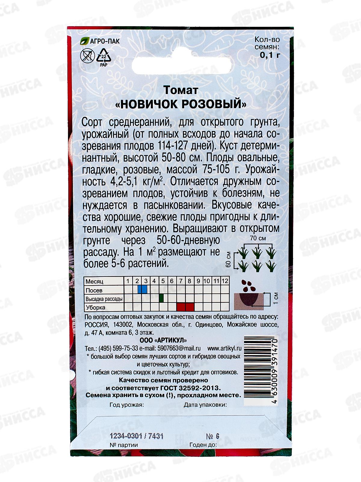 Томат "Новичок розовый" - сорт среднеранний, для открытого грунта, урожайный (от полных всходов до начала созревания плодов 114-127 дней). Куст детерминантный, высотой 50-80 см. Плоды овальные, гладкие, розовые, массой 75-105 г. Урожайность 4,2-5,1 кг/м2. Отличается дружным созреванием плодов, устойчив к болезням, не нуждается в пасынковании. Вкусовые качества хорошие, свежие плоды пригодны к длительному хранению. Выращивают в открытом грунте через 50-60-дневную рассаду. На 1 м2 размещают не более 5-6 растений.